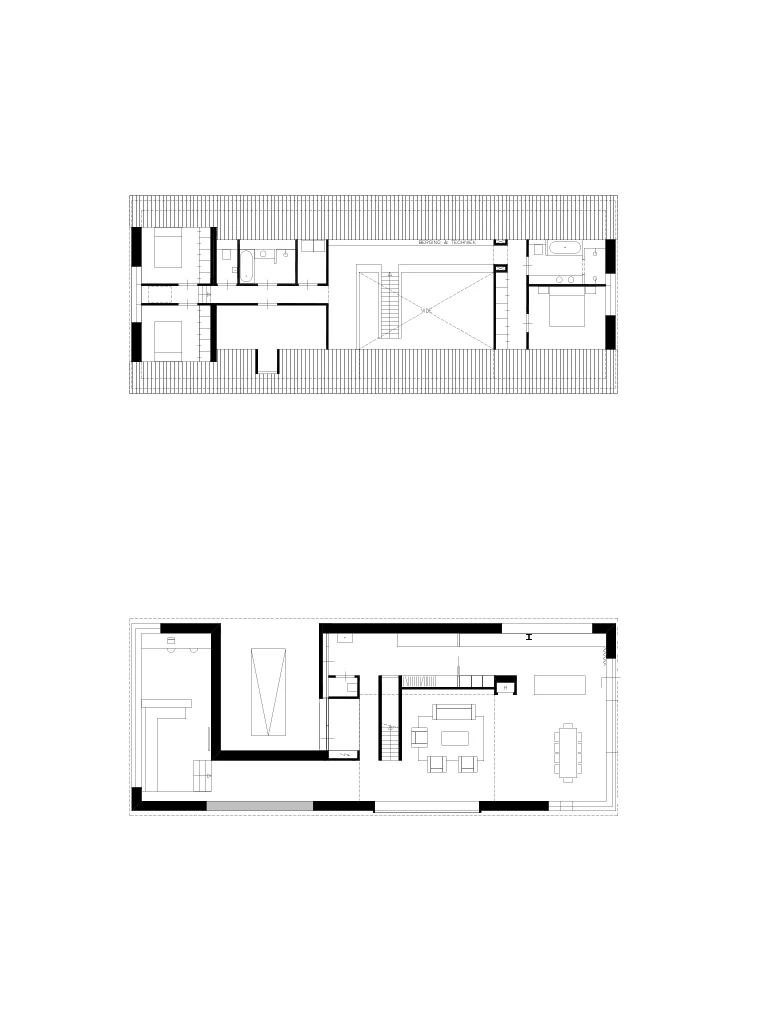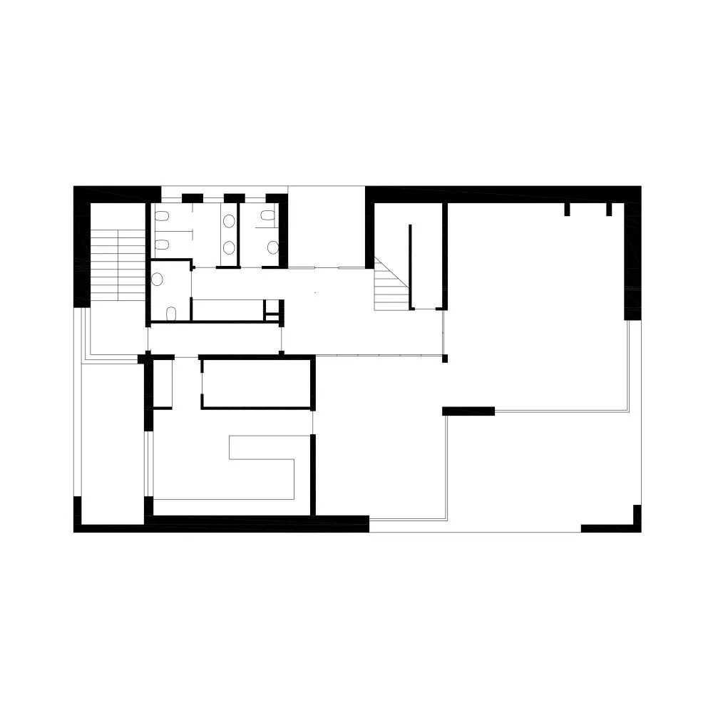 Планировка этажа представляет собой разнообразие открытых пространств, организованных вокруг гостиной двойной высоты. Конфигурация различных пространств внутри прямоугольного объема создает отдельные зоны с разной высотой и ориентацией.