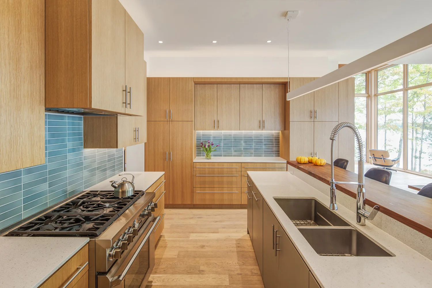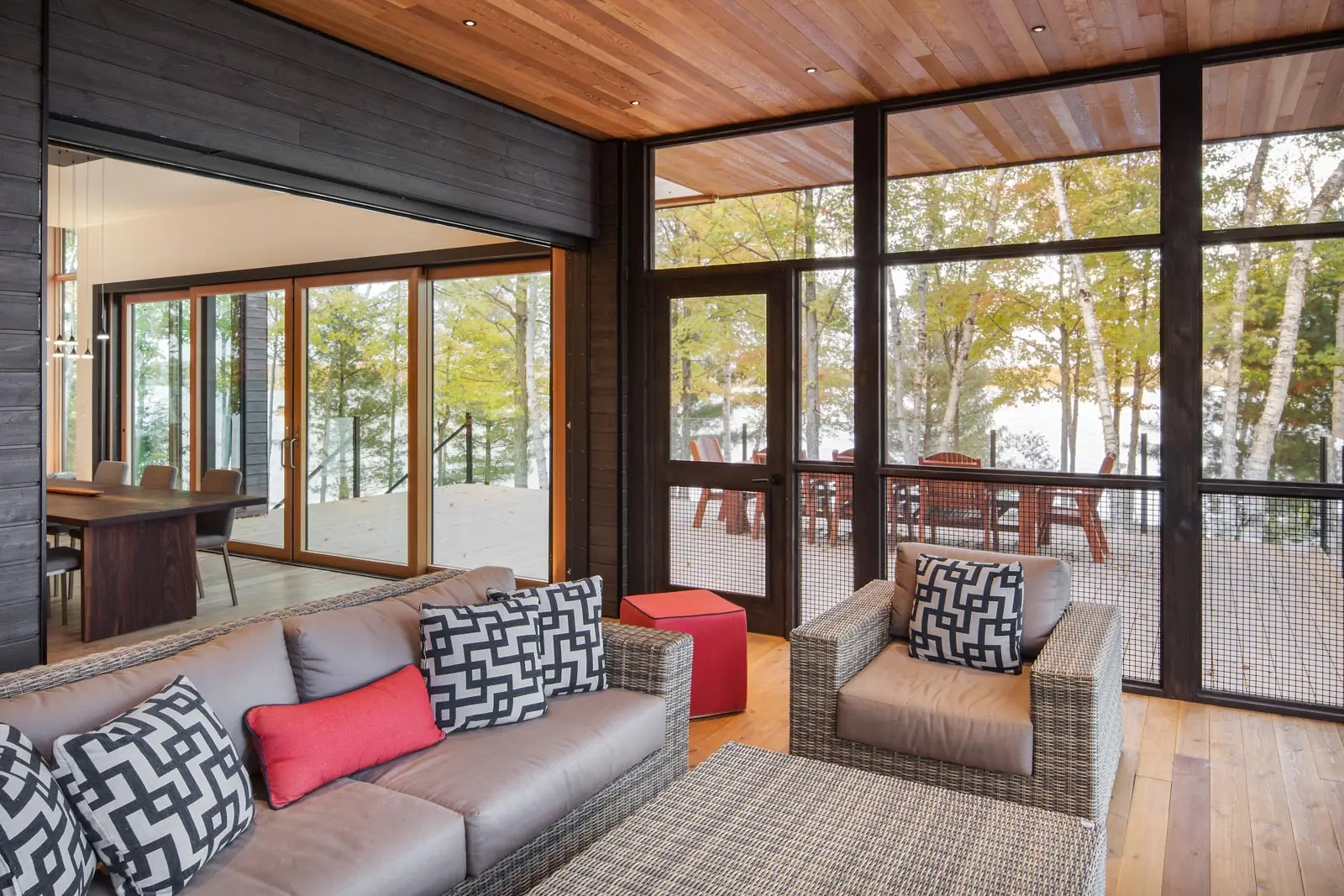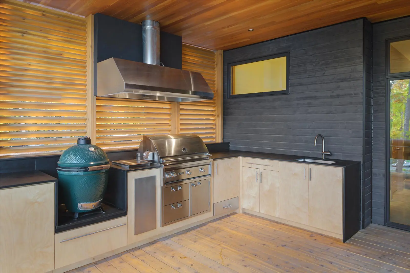 В коттедже есть просторные помещения для общения, рассчитанные на большую семью. Просторная кухня и столовая выходят на крытую веранду через большую раздвижную дверь, которая убирается в стену. К крытой веранде примыкает летняя кухня со встроенным грилем и коптильней, защищенная крышей и ширмой для уединения. Большая терраса расположена на том же месте, что и оригинальная терраса коттеджа, и в течение дня находится как на солнце, так и в тени.