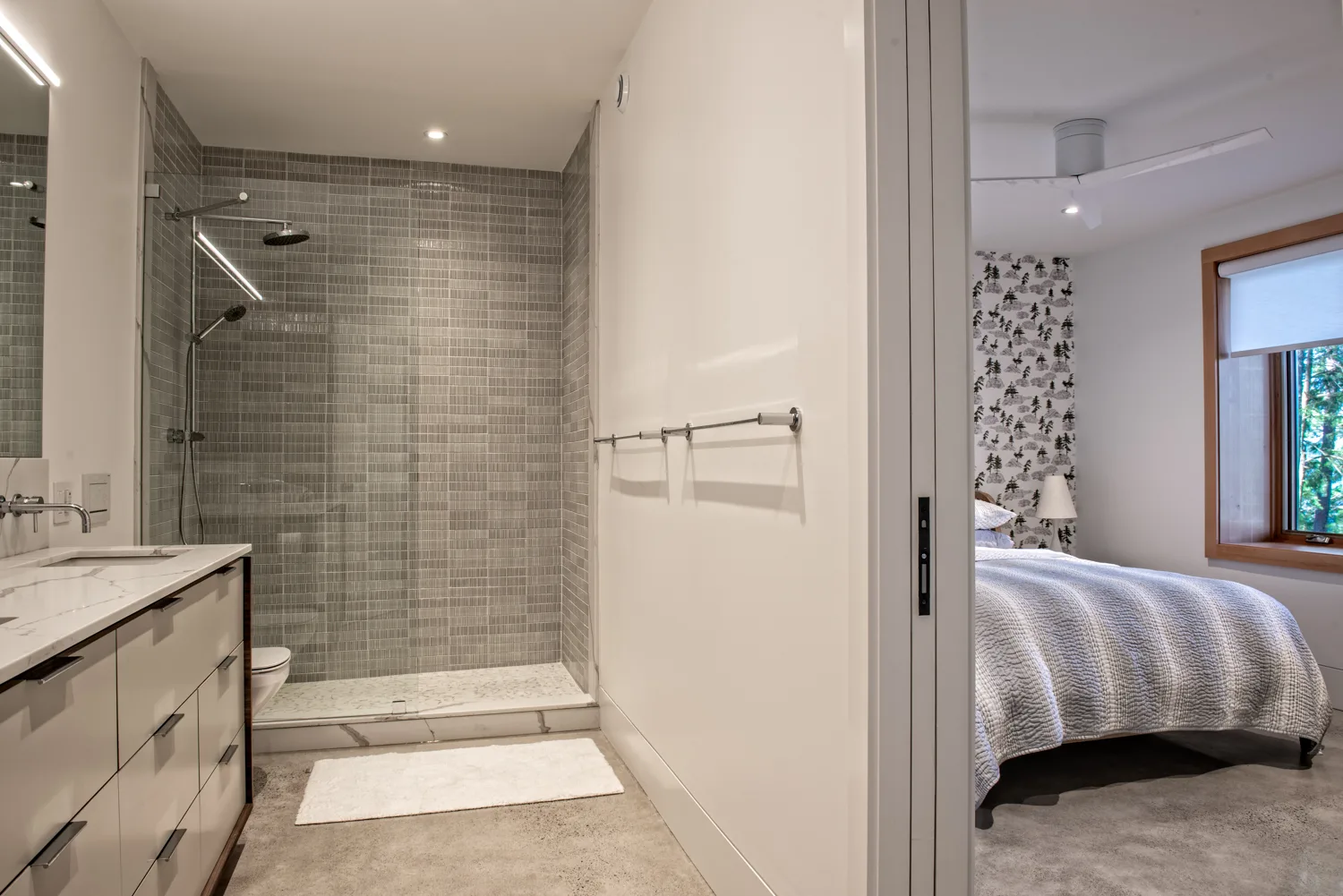 В главной спальне есть ванная комната со стеклянными стенами, из которой открывается вид на озеро.