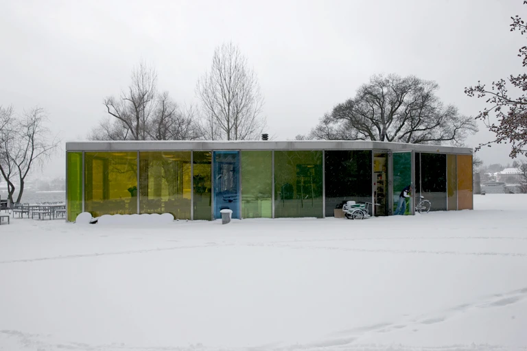 Здание в основном выполнено из стали, что придает ему легкость и прозрачность. Чтобы защитить павильон от вандализма и грязи, в качестве фасадного материала было использовано теплоизоляционное стекло, которое легко мыть и с которого можно без труда удалить граффити.