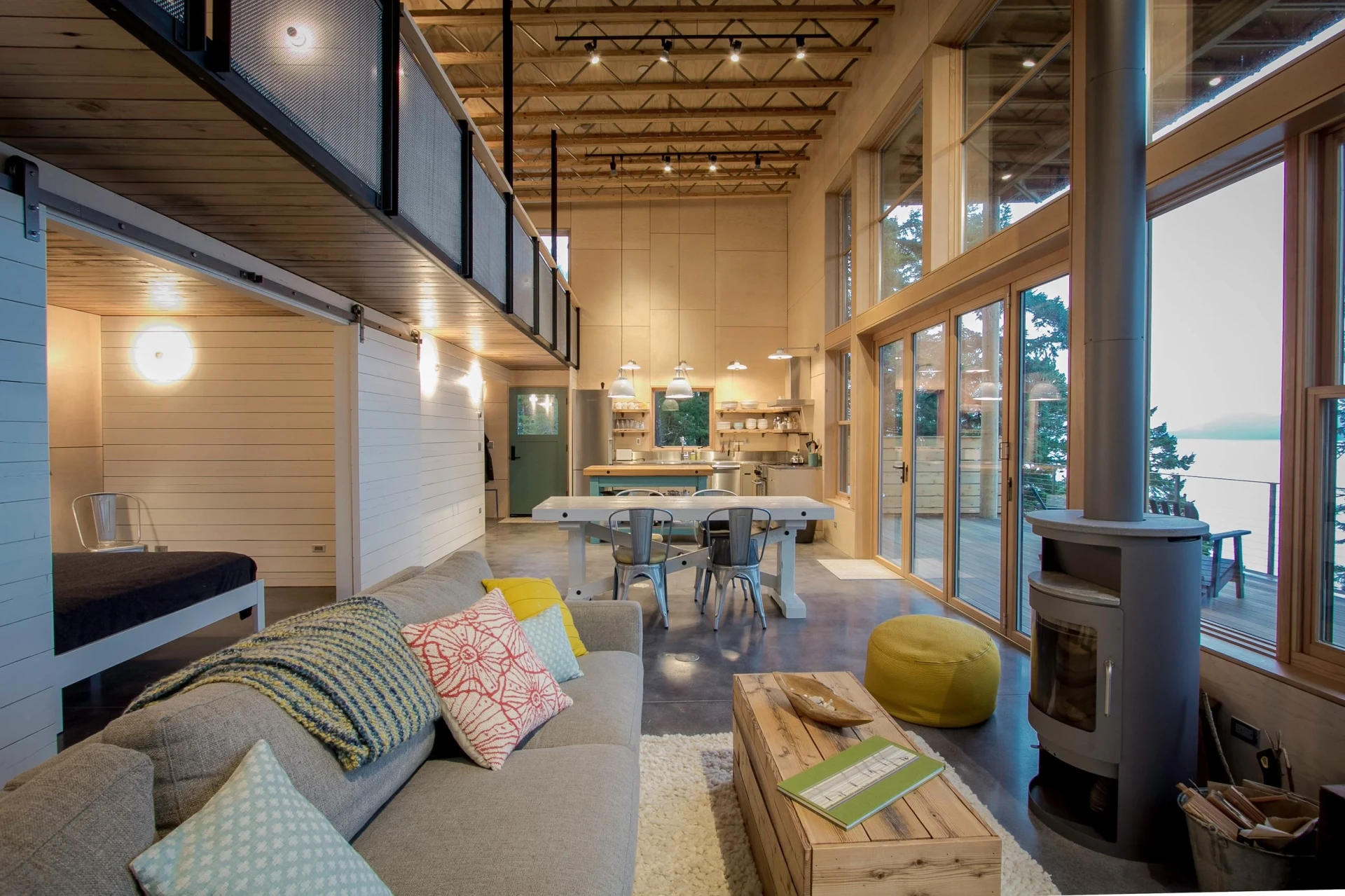В коттедже нет отдельных спален, поэтому для размещения до шести человек используется общая зона. В одном из углов двухэтажного дома расположено большое панорамное окно, из которого открывается прекрасный вид.