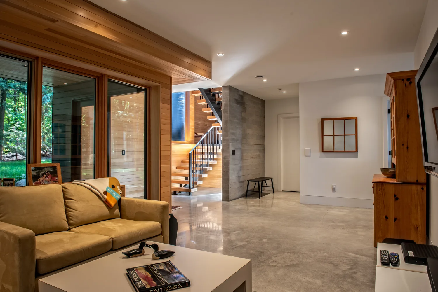 Стеклянные стены обеспечивают хорошее естественное освещение внутренних помещений и открывают вид на окружающий лес. Открытость, которую создают стеклянные стены, удовлетворяет желание жильцов видеть и слышать птиц, обитающих вокруг, и позволяет дому чувствовать себя частью окружающего ландшафта.