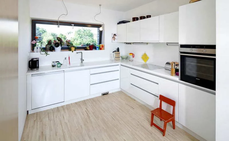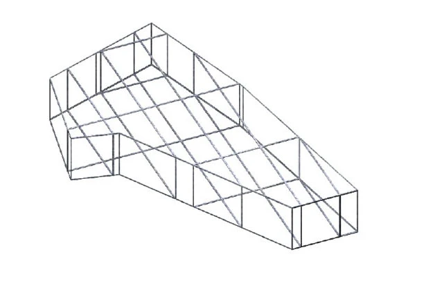 Каркас, куб размером 6x6x6 метров, состоит из креплений, которые спрятаны в Доме. В этом квадрате на первом этаже находится кухня-столовая, являющаяся стержнем Дома.