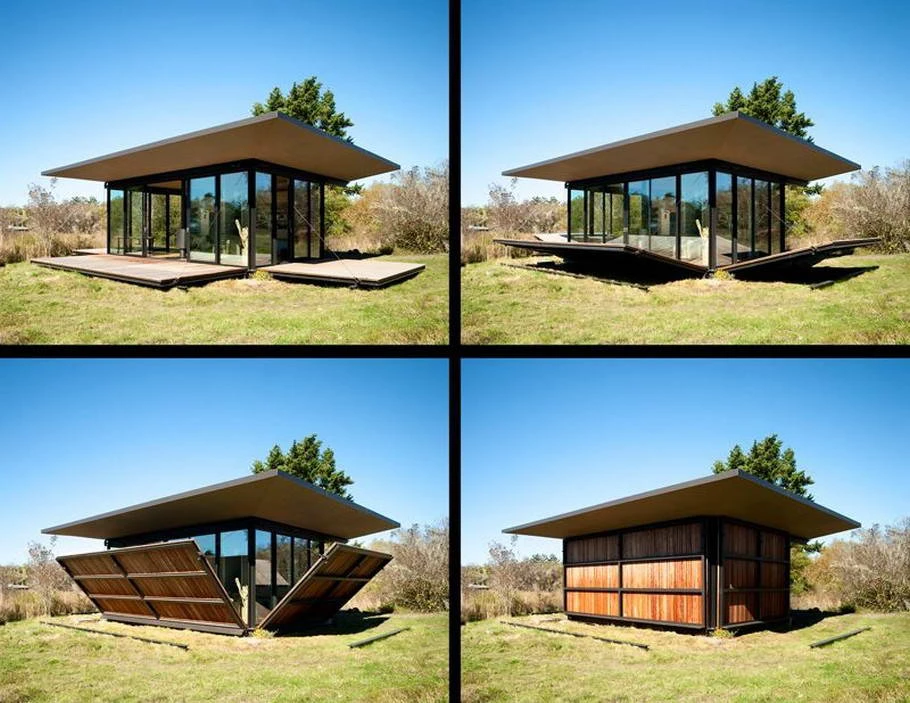 Три деревянных палубы по периметру дома могут быть при необходимости подняты с помощью механической системы из гидравлических лебёдок, тросов и блоков, превратившись в защитные жалюзи, надёжно защищающие дом, а мощные козырьки закрывают внутреннее пространство от летнего солнца с трёх сторон.