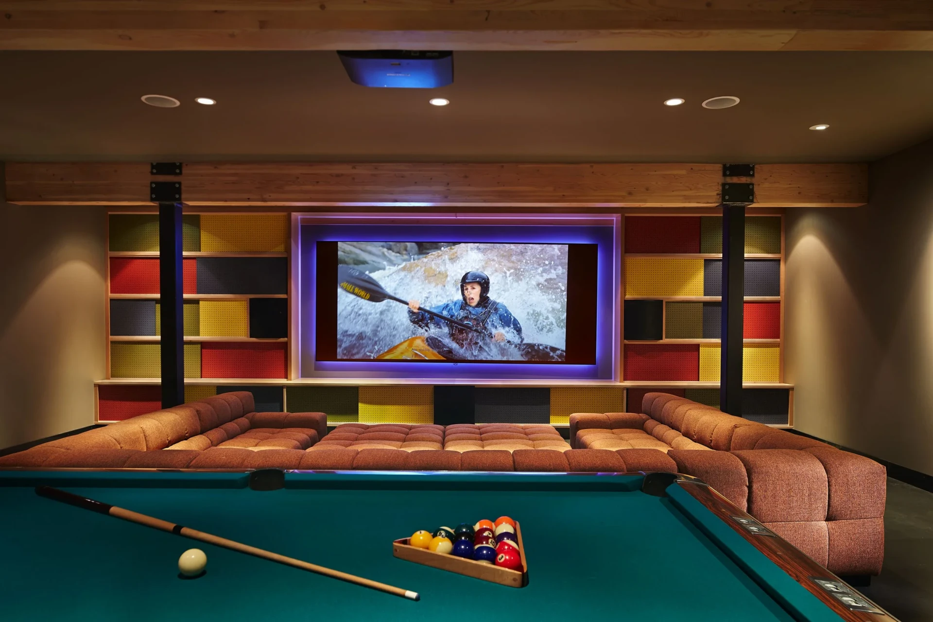В отделке использованы базальт и мрамор, которые контрастируют с обилием дуба и ореха, создавая «ощущение защищенности и тепла в снежные ночи. Несмотря на то, что здание построено из изысканных материалов, наружные стены отделаны необработанным камнем, имитирующим горный ландшафт.