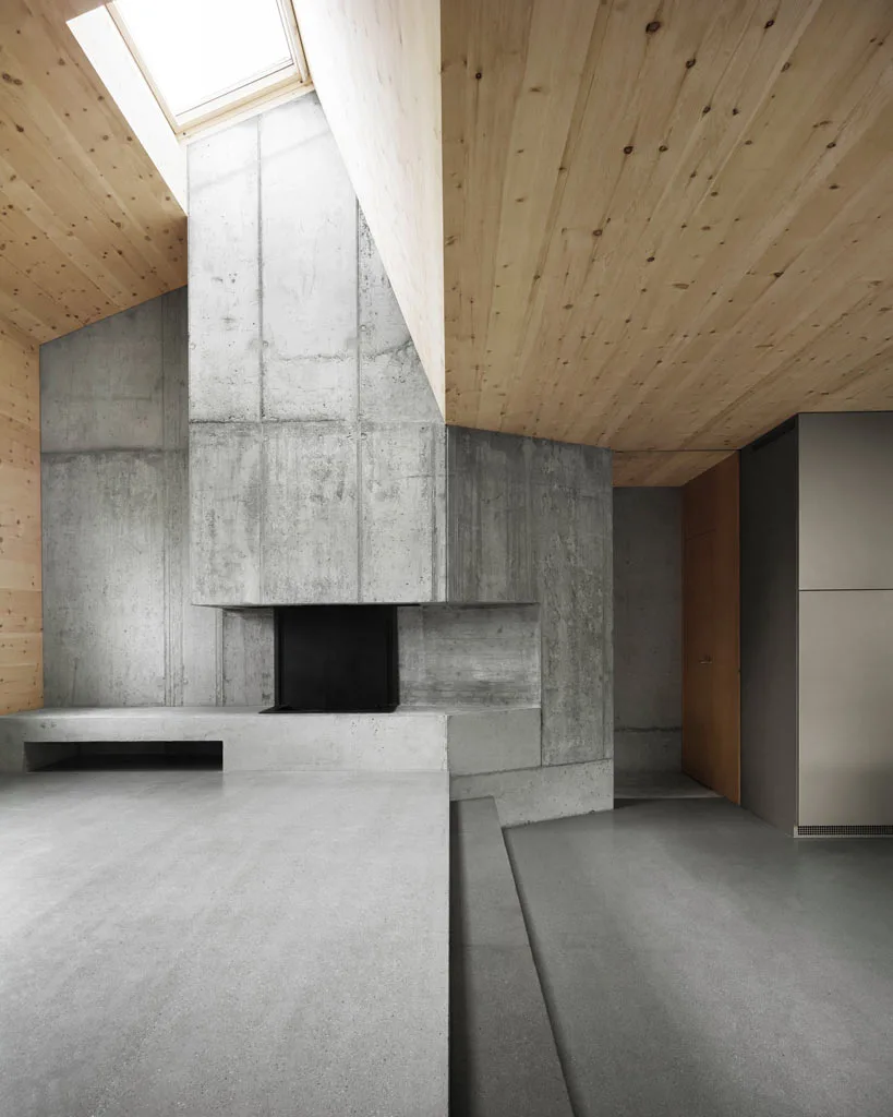 Стальной несущий каркас обнажается по мере того, как отслаивается монолитная деревянная обшивка. Два гигантских водостока отводят дождевую воду с крыши. Это прочное, массивное здание в мощном ландшафте, которое со временем не утратит своей красоты. Однако его облик смягчают многочисленные разрезы, которые подчеркивают особенности участка, климата и открывающихся видов.