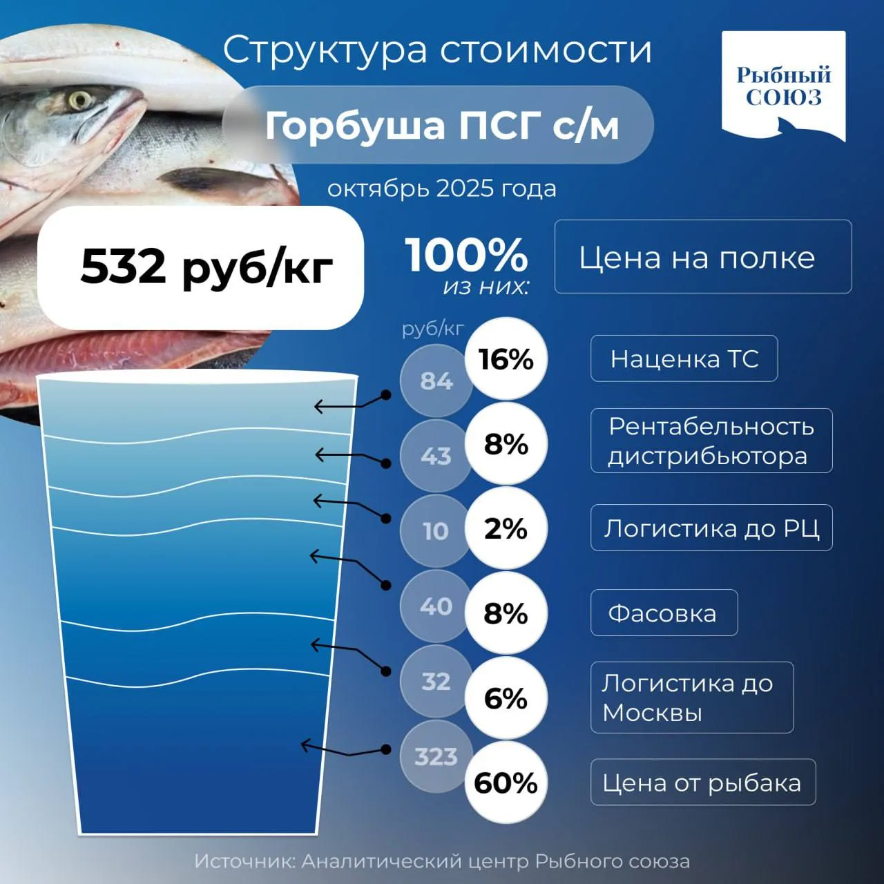 Аналитический центр Рыбного Союза посчитал структуру стоимости свежемороженой горбуши ПСГ в октябре при средней розничной цене 532 рублей за кг в Центральной России: