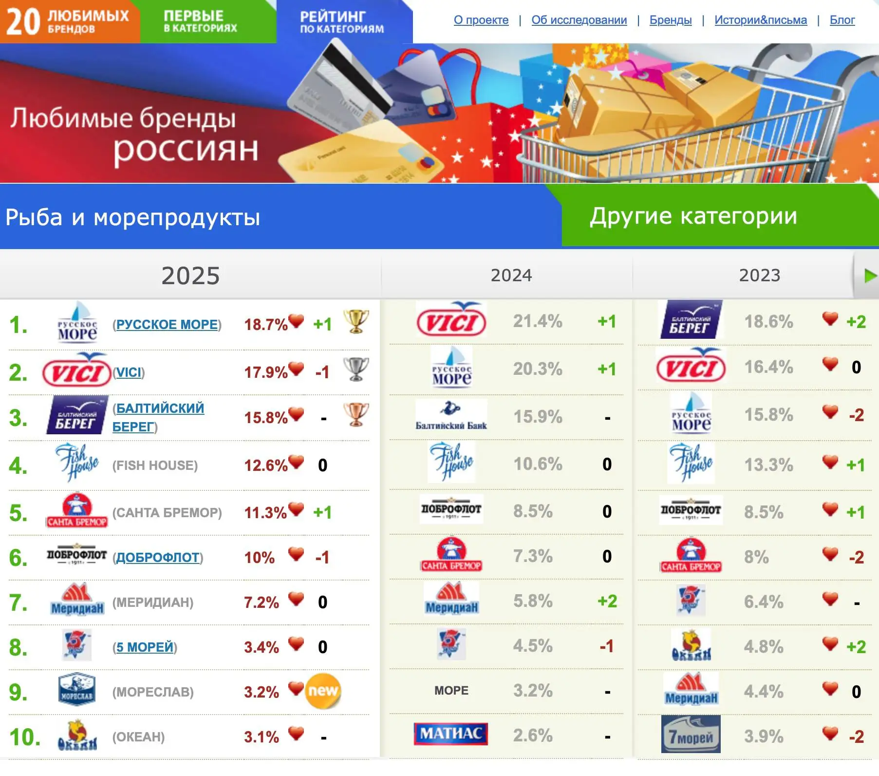 Итак, любимым рыбным брендом россиян по итогам 2025-го стало "Русское море" (18,7% голосов). Оно поднялось на одну позицию по сравнению с прошлым годом. Vici (17,9%) же опустилось на 2-е место, а "Балтийский берег" (15,8%) остался на 3-м.