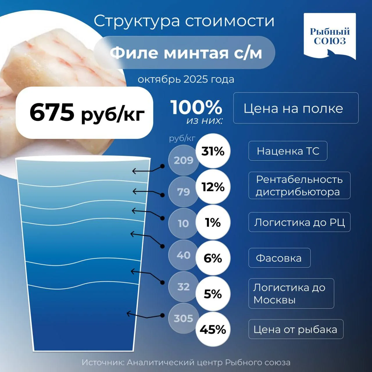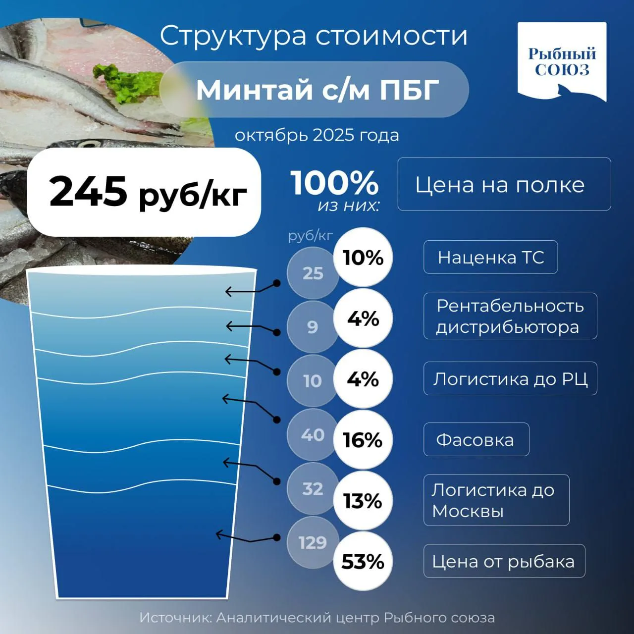 Аналитический центр Рыбного Союза посчитал структуру стоимости свежемороженого минтая ПБГ в октябре при средней цене 245 рублей за кг: