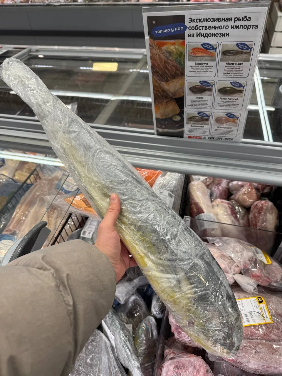 Заметили, что на прилавках сети "Спар" появились экзотические виды рыб прямиком из Индонезии – барамунди, рыба-попугай, барабуля, махи-махи и другие.