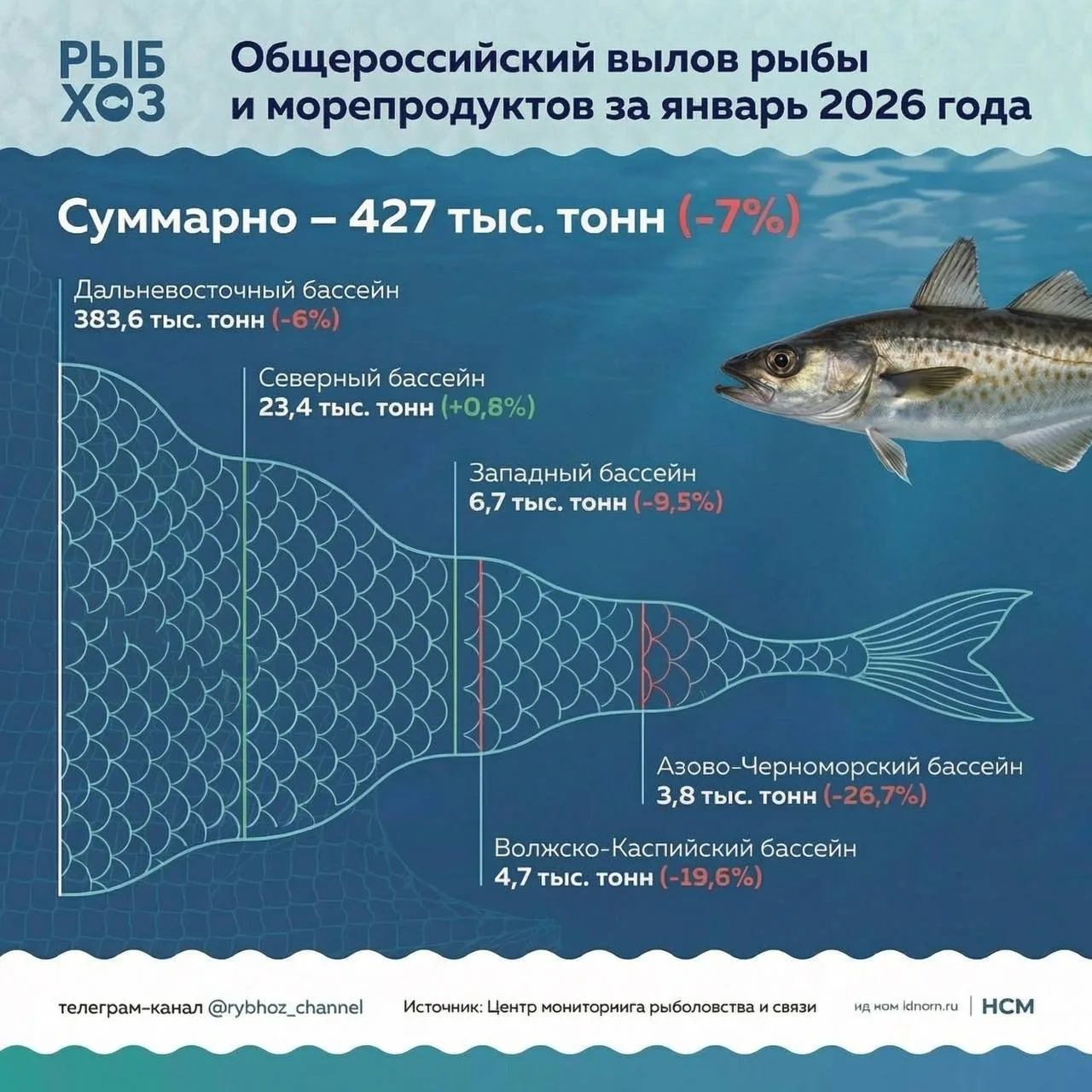 По данным Центра мониторинга рыболовства и связи, по итогам января общероссийский вылов водных биоресурсов снизился на 7% по сравнению с аналогичным периодом прошлого года, до 427 тыс. тонн: