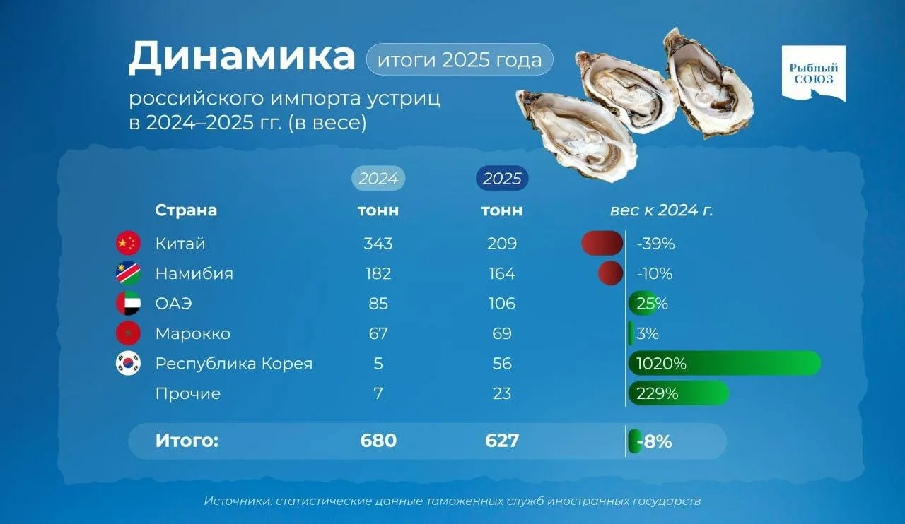 По данным Аналитического центра Рыбного Союза, ввоз устриц на российский рынок по итогам 2025 года снизился на 8% в весе, до 627 тонн. Такая динамика может быть связана с замедлением роста рынка HoReCa в стране, который за прошлый год прибавил лишь 7-8% (против 12% в 2024-м).