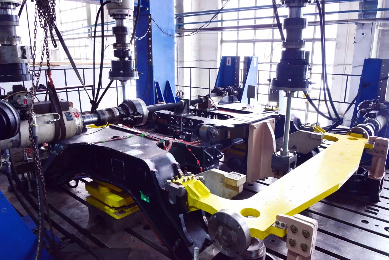 На протяжении трëх месяцев в круглосуточном режиме на стенде с помощью гидравлических цилиндров нагружали раму. Больше 150 тензодатчиков мониторили состояние опытного образца.
