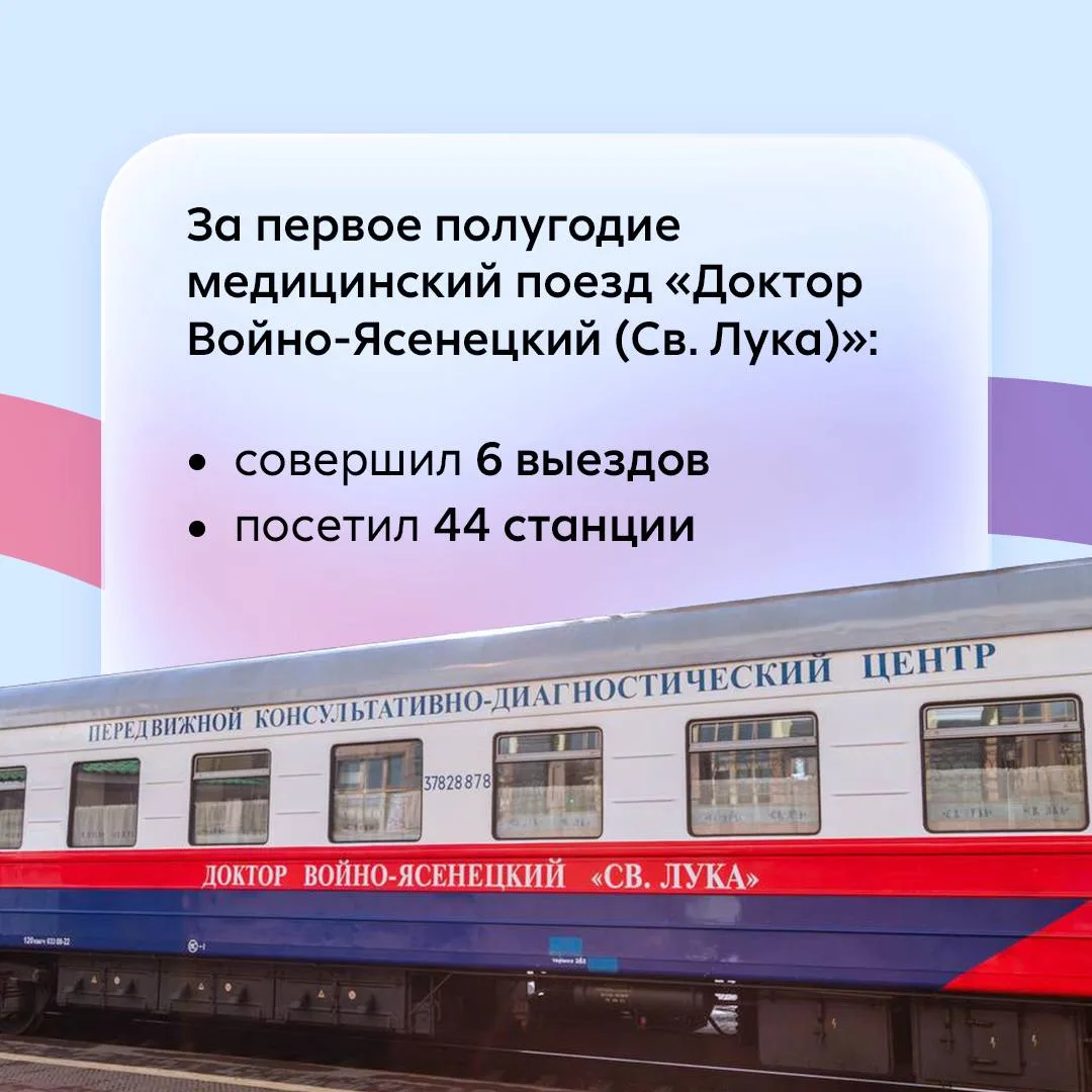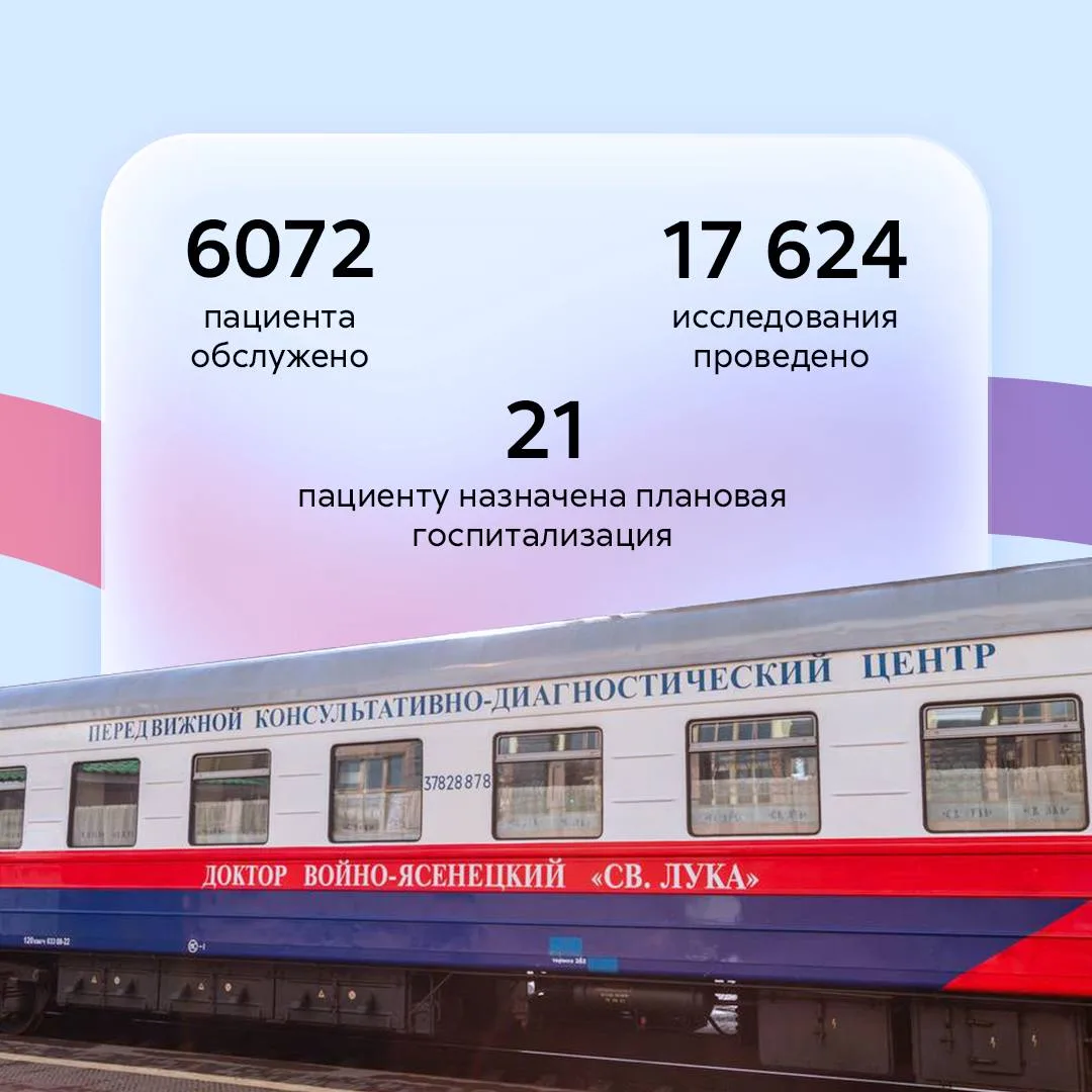 Наш поезд «Доктор Войно-Ясенецкий (Св. Лука)», который курсирует по Красноярской железной дороге, регулярно принимает тысячи пациентов в небольших населенных пунктах. Все для того, чтобы как можно больше людей получали качественную медицинскую помощь.