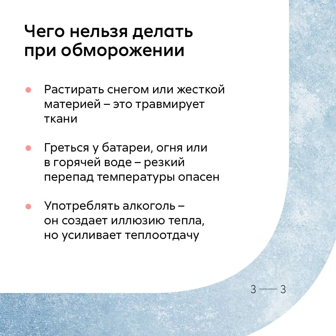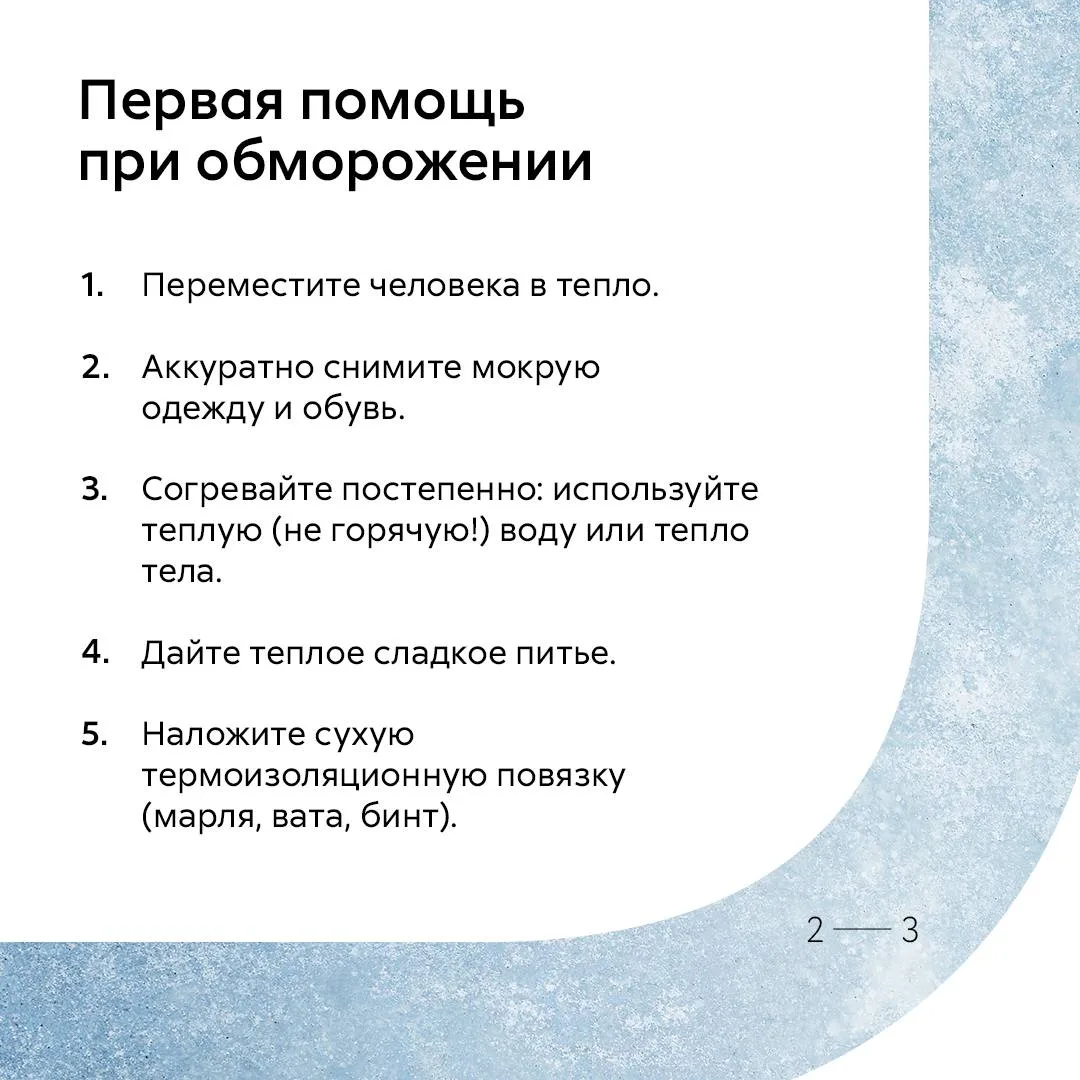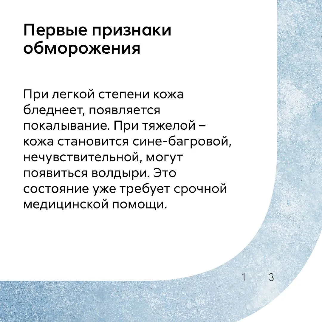 А про симптомы, первую помощь и о том, чего нельзя делать при обморожении, читайте в карточках.