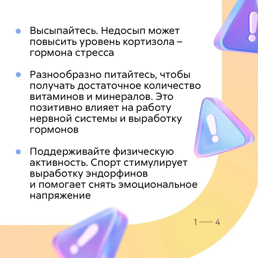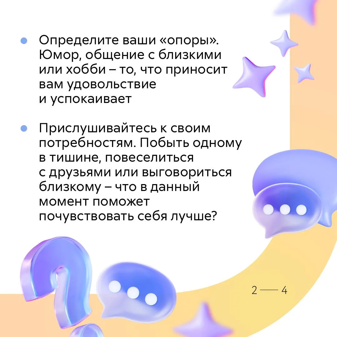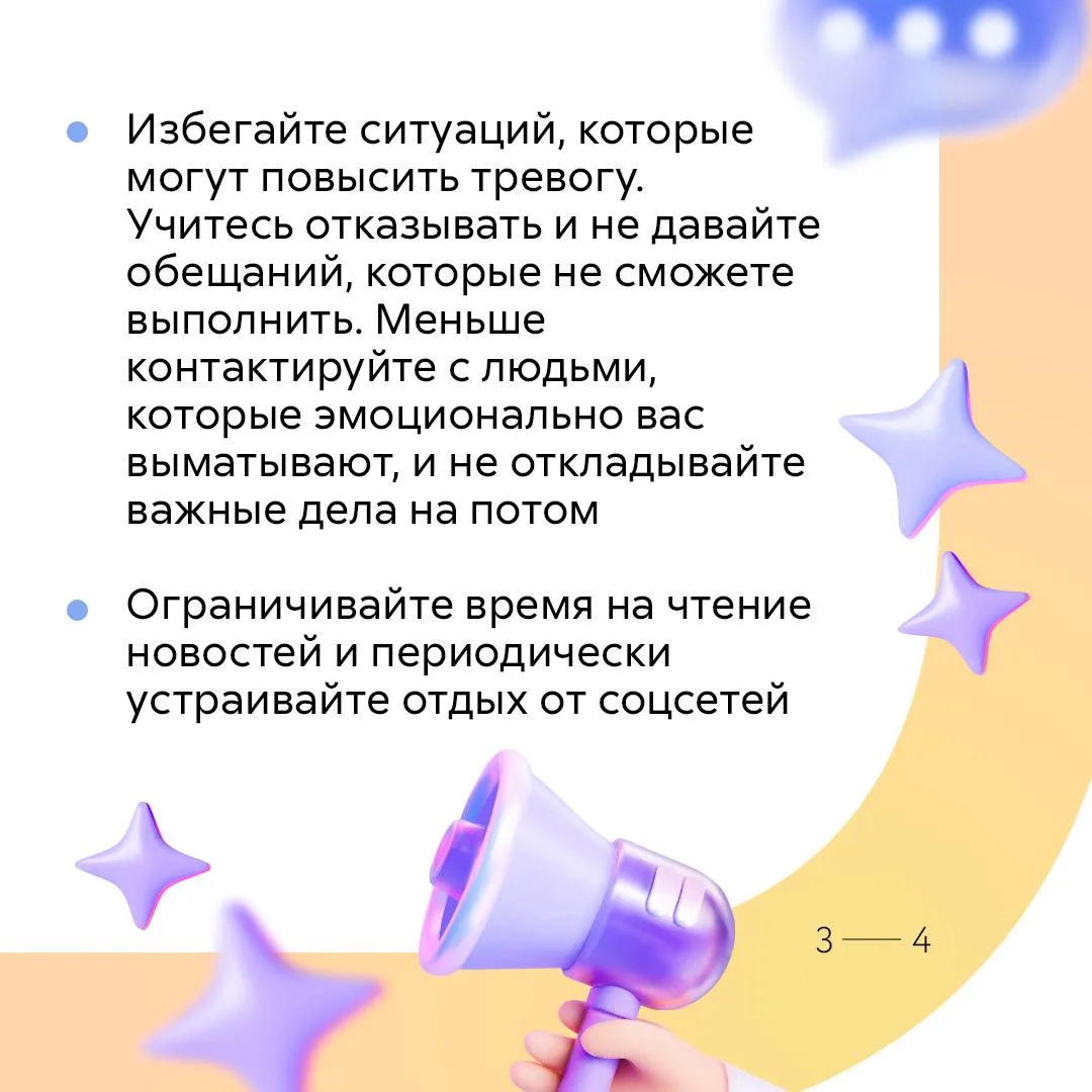 Когда речь идет о расстройствах, справиться с ними поможет именно специалист. Но чтобы противостоять внешним факторам, есть несколько способов позаботиться о себе. Их вы найдете в карточках.