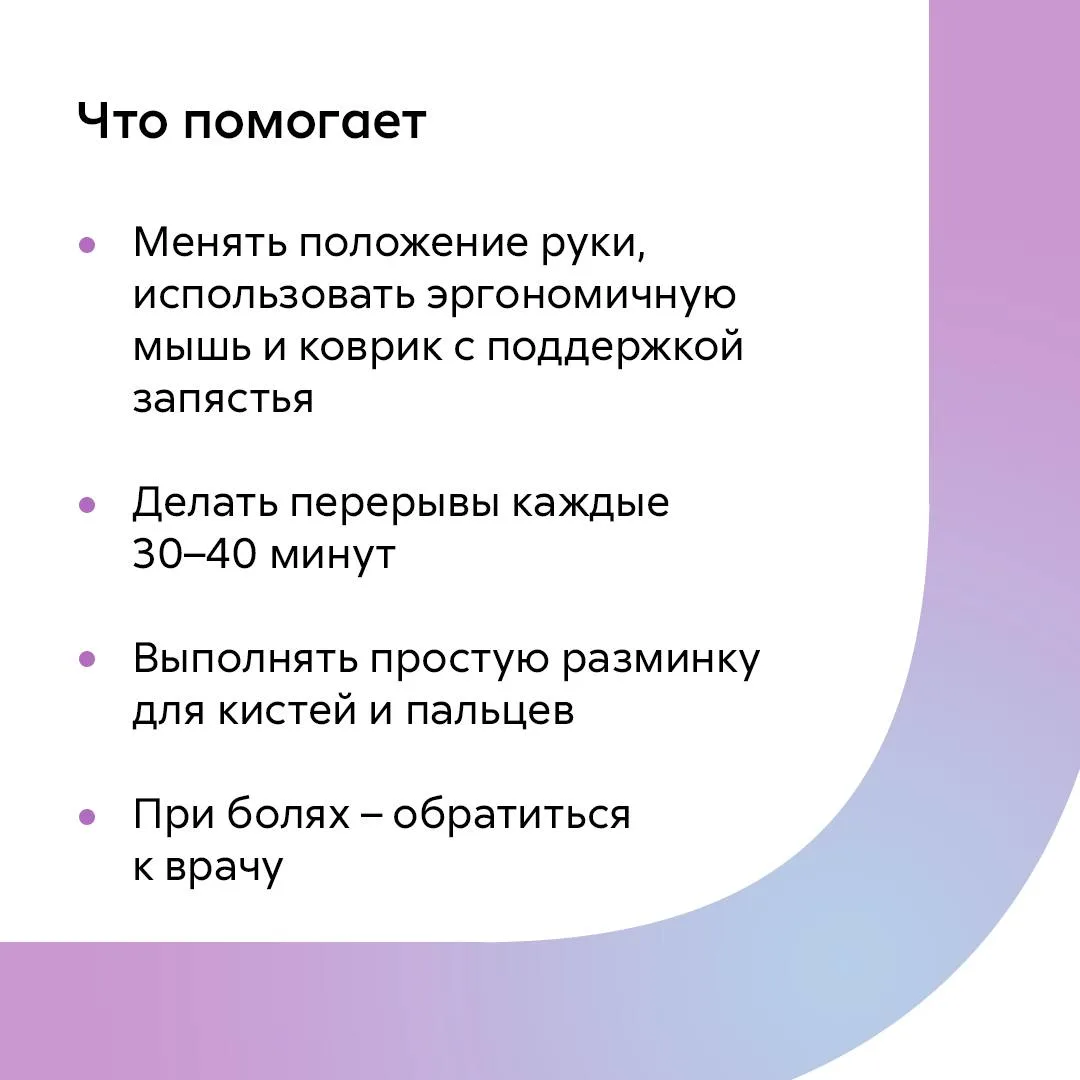 Каждый день рука преодолевает километры: от кнопки «Отправить» до «Закрыть вкладку». Но мышцы и сухожилия не знают, что мы просто работаем, – для них это марафон без перерыва. Так и появляется синдром компьютерной мыши (туннельный синдром) – воспаление сухожилий и сдавливание нервов из-за постоянных однообразных движений. Если махнуть на это рукой, дело может дойти до хронической боли.