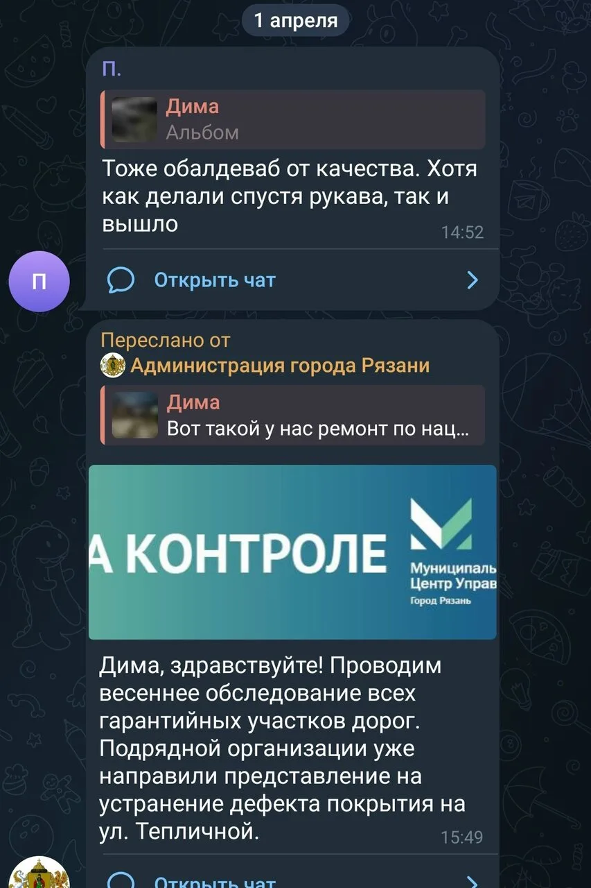 Того же числа, в телеграмм, администрация города Рязани дала ответ по ситуации. (ответ ниже на фото) Спустя пару дней ямы засыпали щебнем. Хоть что-то.