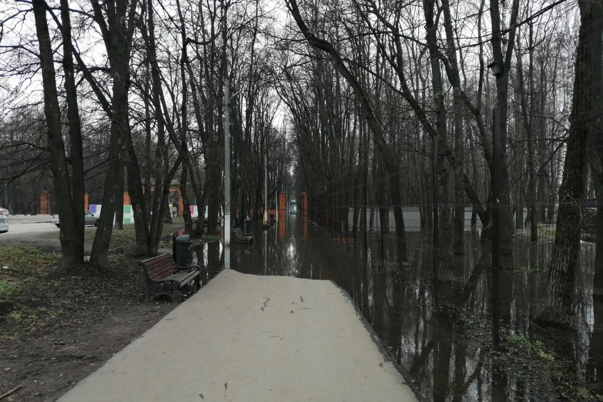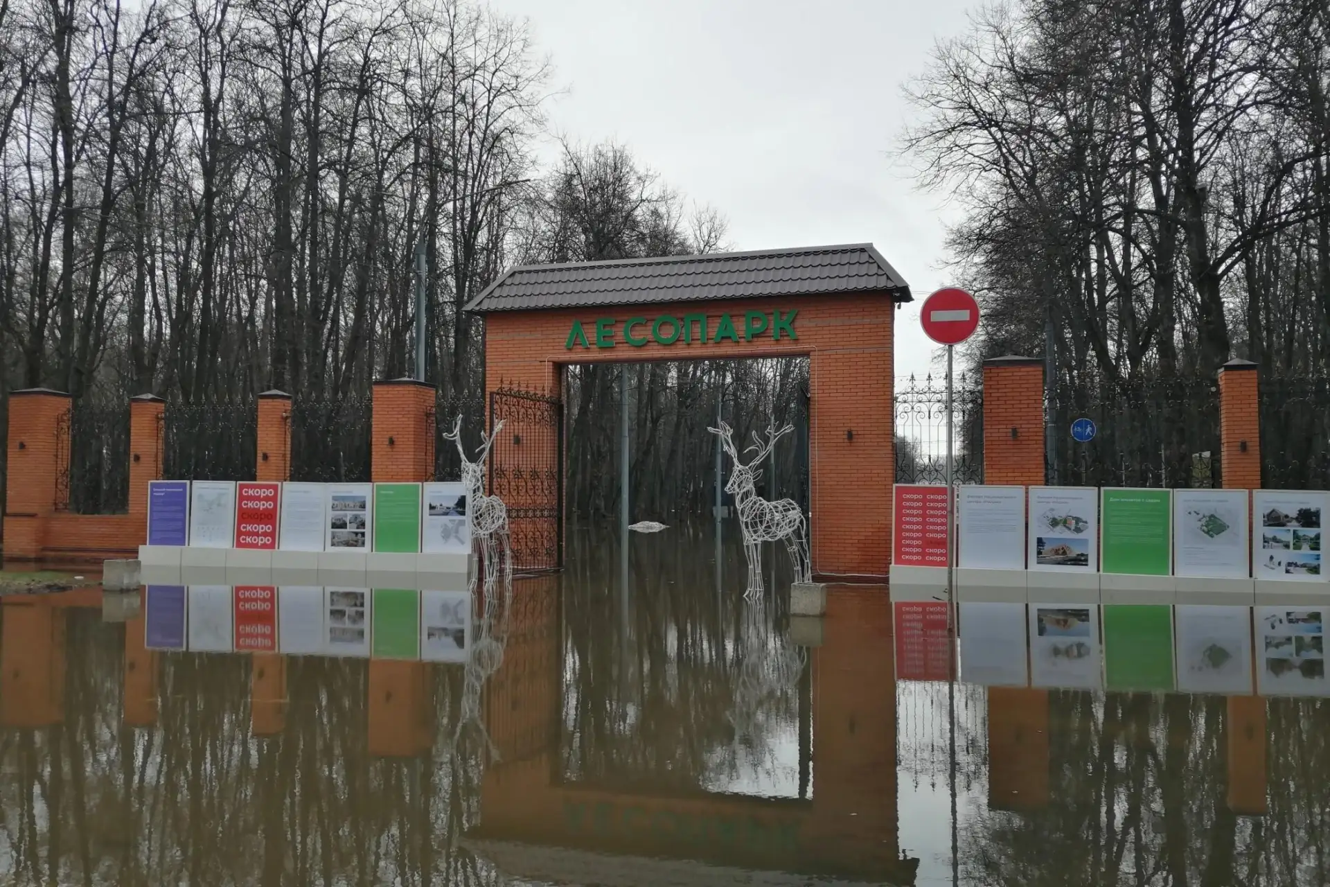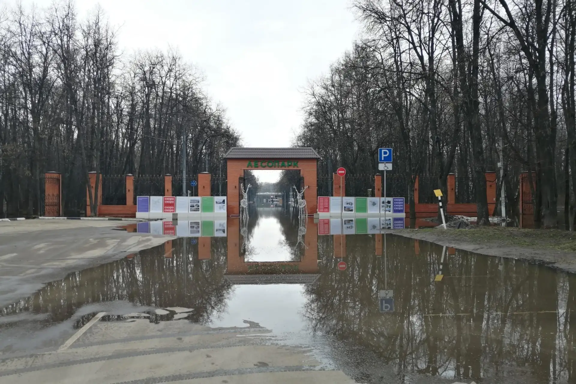 🌊 В Лесопарке река вышла за ворота и заливает парковку, на Окском шоссе вода пошла из трубы, но дорогу пока не затопила.
