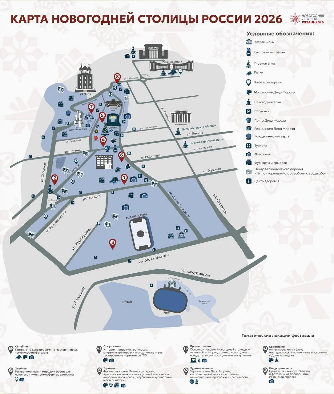 🥳Через три дня Рязань станет «Новогодней столицей». На карте – все площадки, где будет интересно: Лыбедский бульвар, улица Почтовая, Соборный парк, кремль, Рязанская ВДНХ, Лесопарк, ЦПКиО.