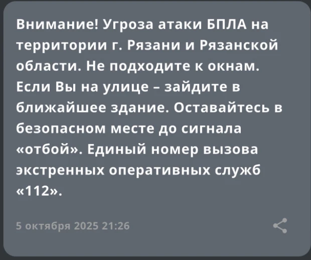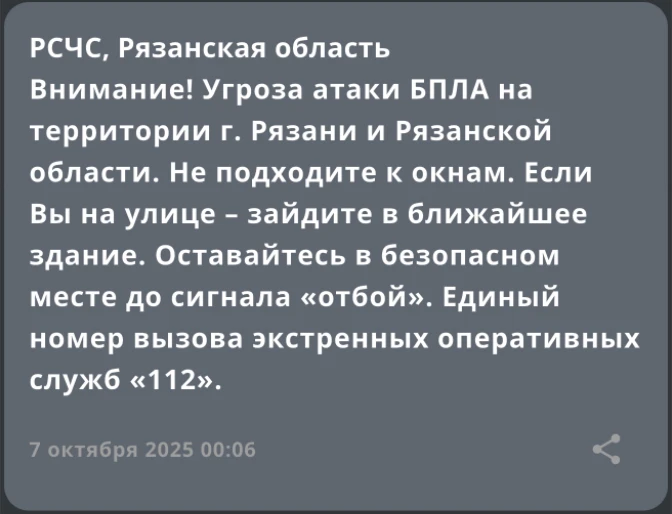 ❗️ Угроза атаки БПЛА объявлена на территории Рязани и Рязанской области