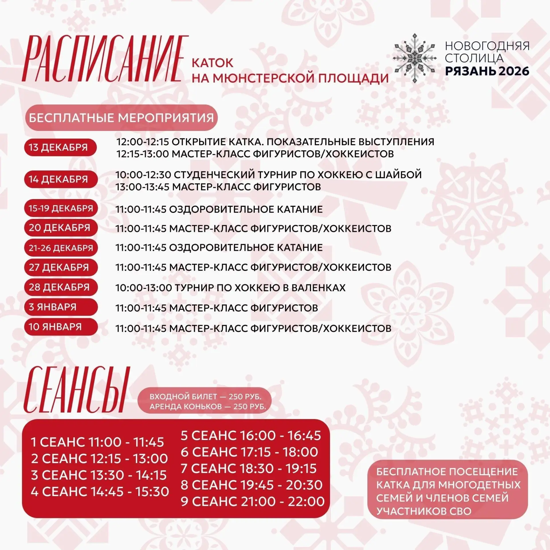 ⛸️ Каток на Мюнстерской площади откроется 13 декабря: вход — 250 рублей, аренда коньков — 250. Опубликовано полное расписание, а также список бесплатных мероприятий и мастер-классов.