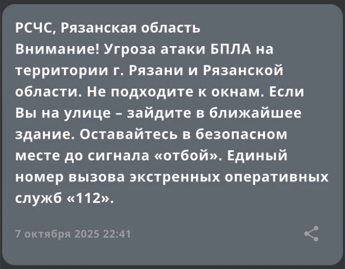 🔴 Внимание! Опасность атаки БПЛА на территории Рязанской области, — РСЧС.