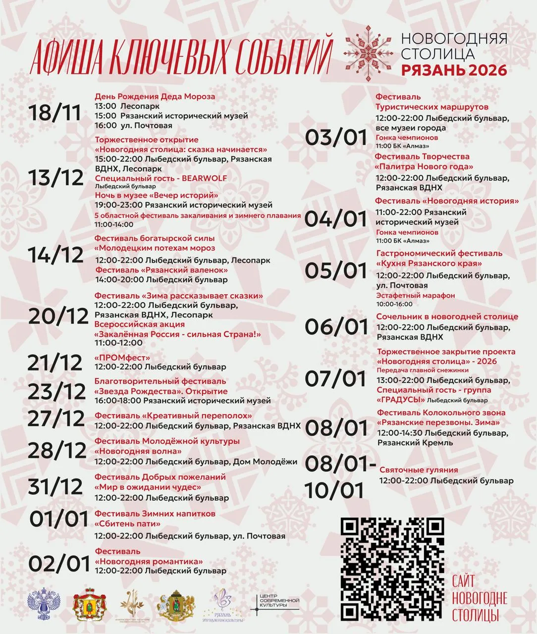Программа стартует 13 декабря на Лыбедском бульваре. Откроется площадка фестиваля «Кухня Рязанского края». Начнёт работу каток. Вечером – концерт, хедлайнером станет певица Bearwolf.