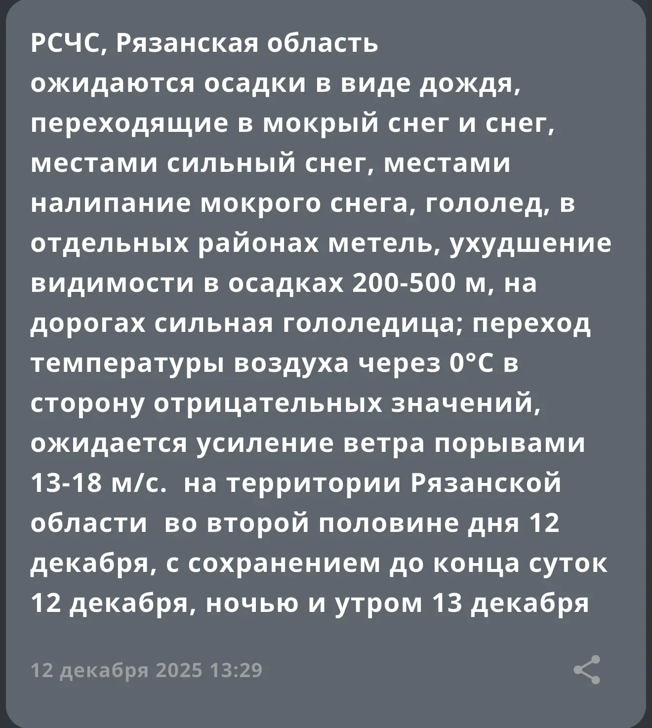 ❗️ МЧС предупреждает о резком ухудшении погоды в Рязанской области 12-13 декабря.
