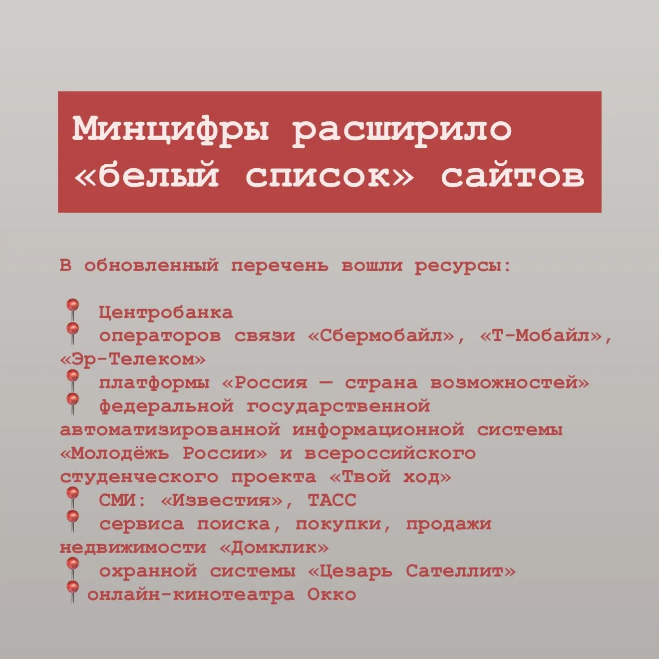 🤍 Список сайтов, работающих без интернета, пополнился несколькими ресурсами. О том, какие именно страницы вошли в так называемый «белый список», рассказало Минцифры России.