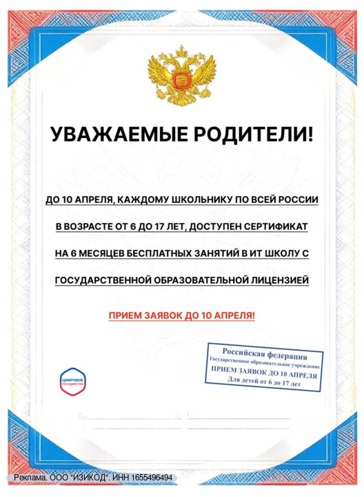 ❗️ Уважаемые родители, внимание! До 10 апреля каждый ребенок РФ в возрасте от 6 до 17 лет может получить сертификат на 6 месяцев бесплатных занятий в школе программирования с государственной образовательной лицензией.