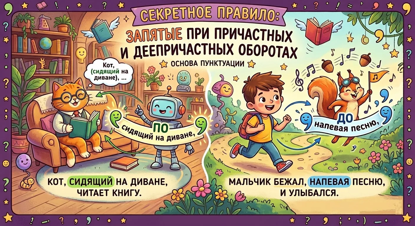 ⚡ «Запятые при причастных и деепричастных оборотах».