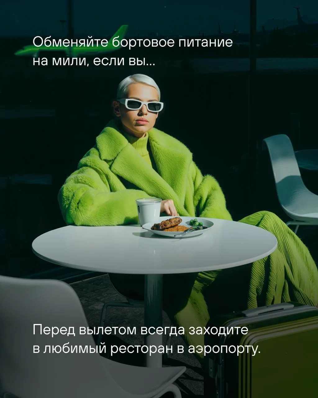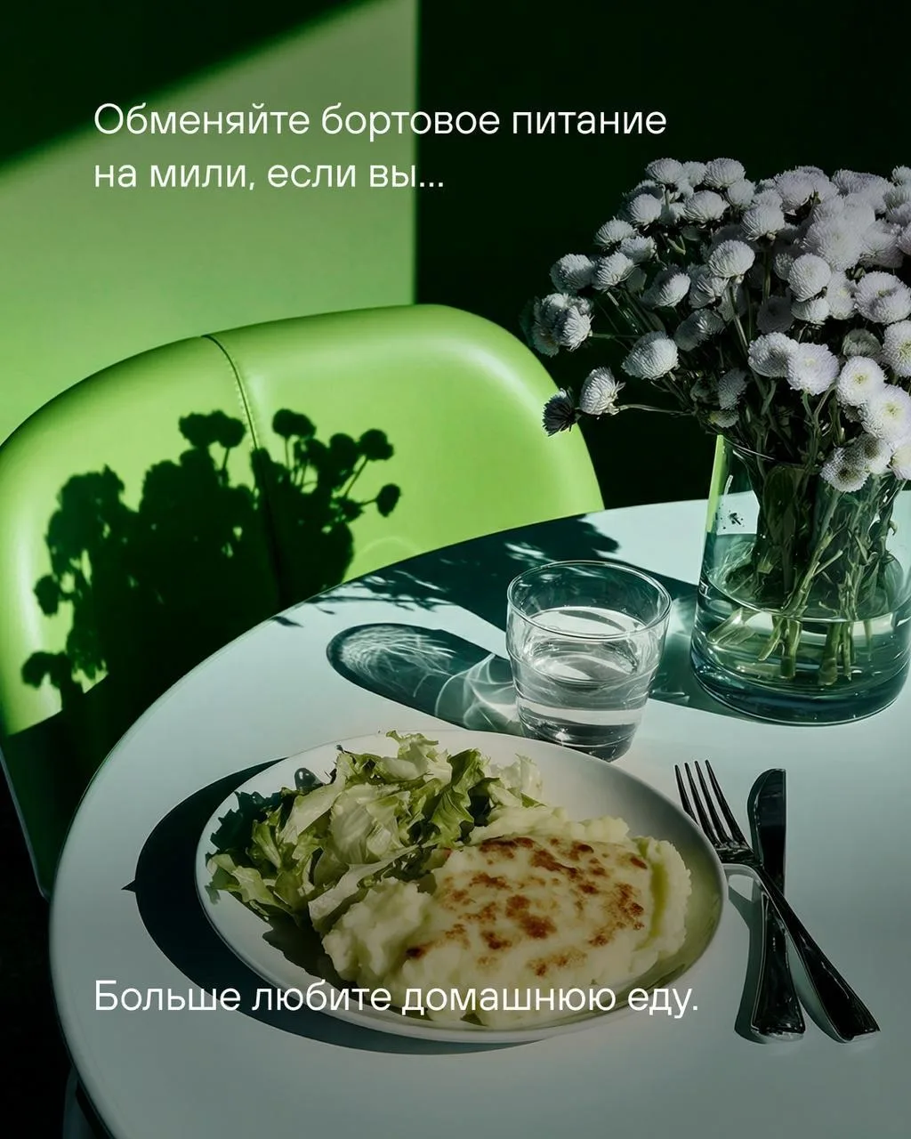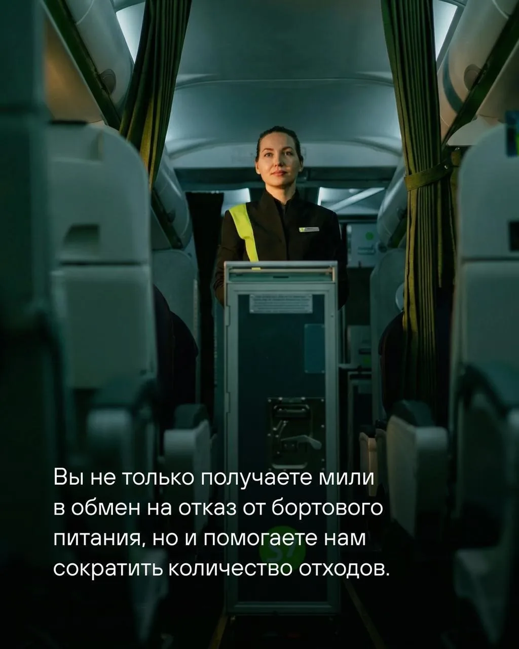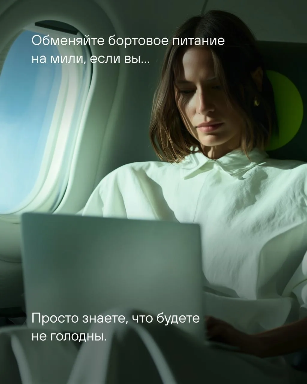 Так вы не только получаете мили, но и помогаете нам точнее планировать рационы перед каждым вылетом и сокращать количество отходов, а значит — делать планету чуть чище и зеленее.