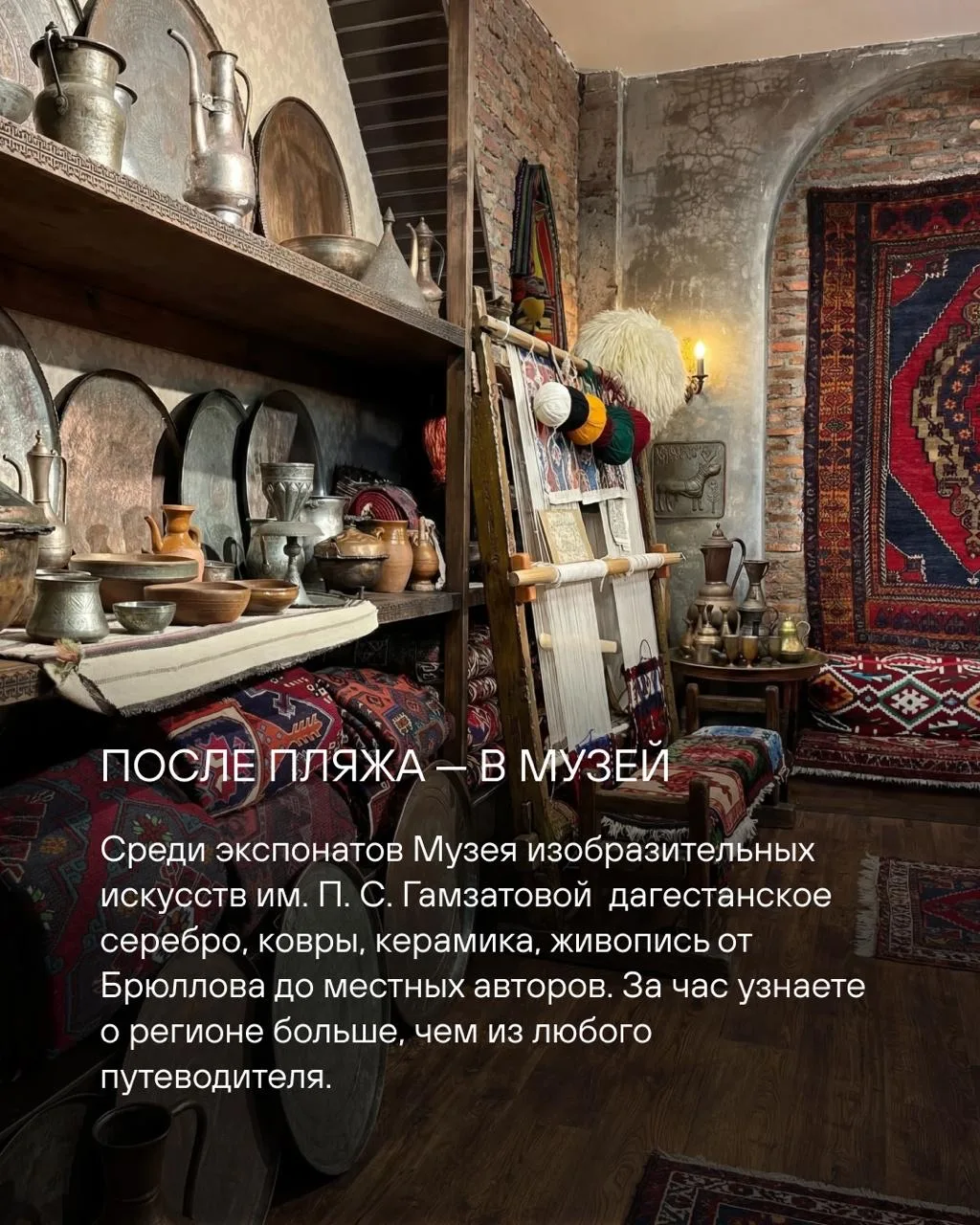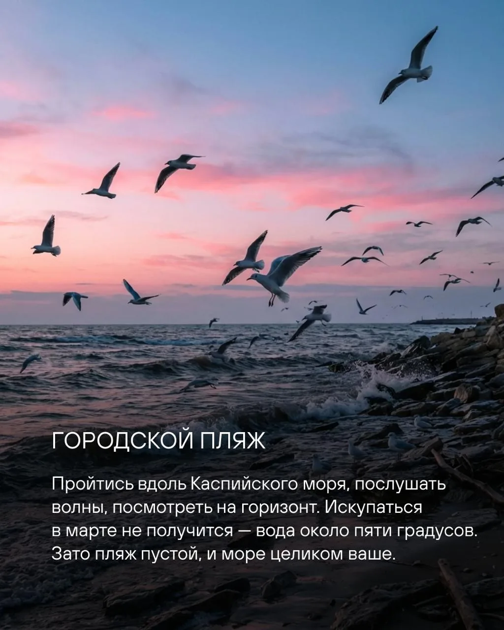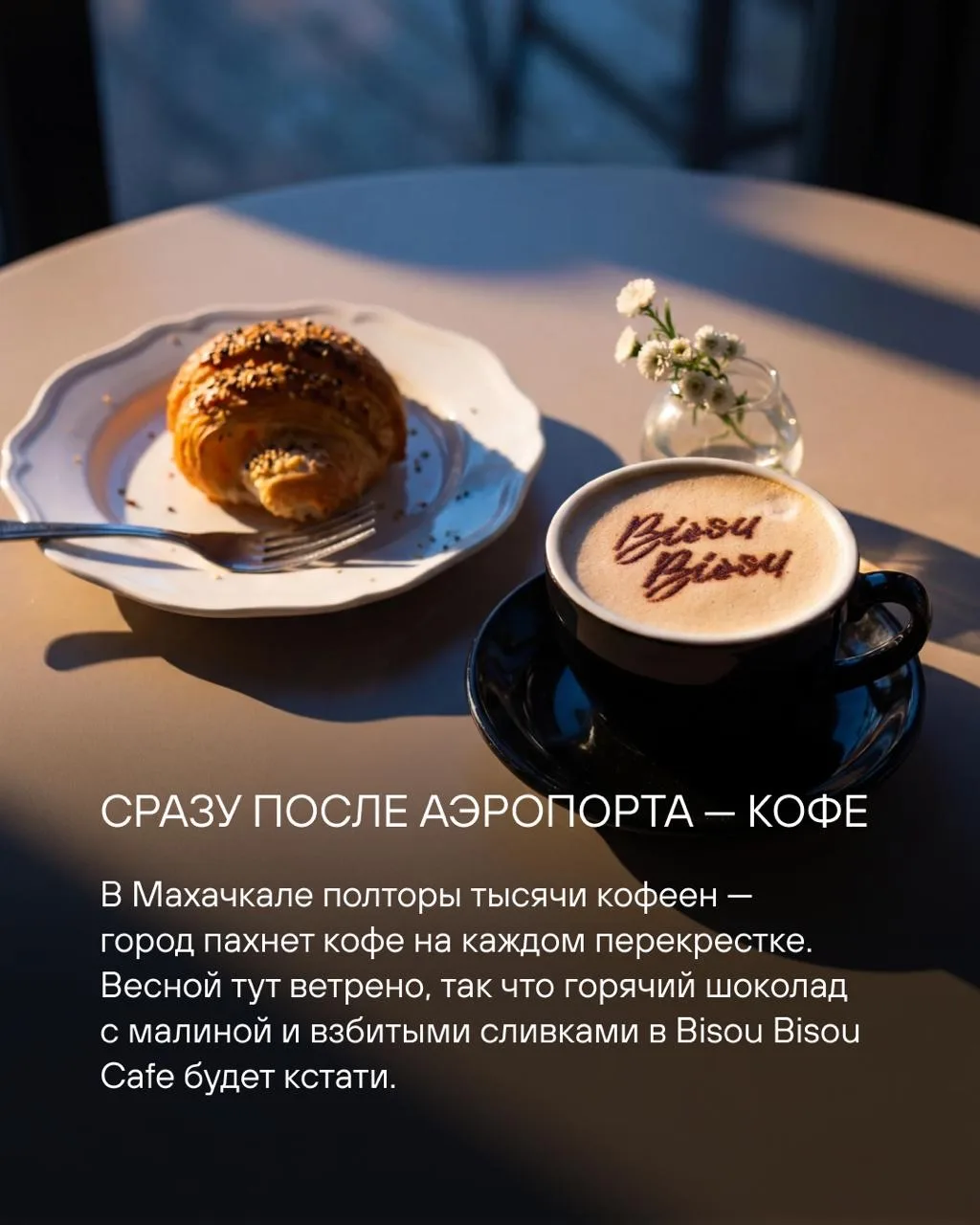 Латте с урбечем, балконы на каждом этаже — их пристраивают к уже готовому дому, и каждый не похож на соседний — и Каспийское море в марте. Все это Махачкала. Летаем туда из Москвы и Новосибирска. Билеты — по ссылке.