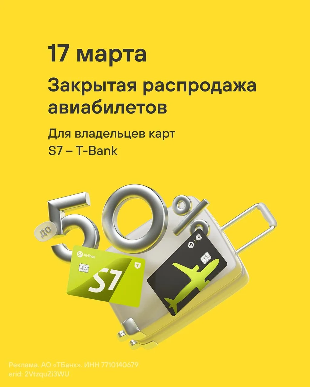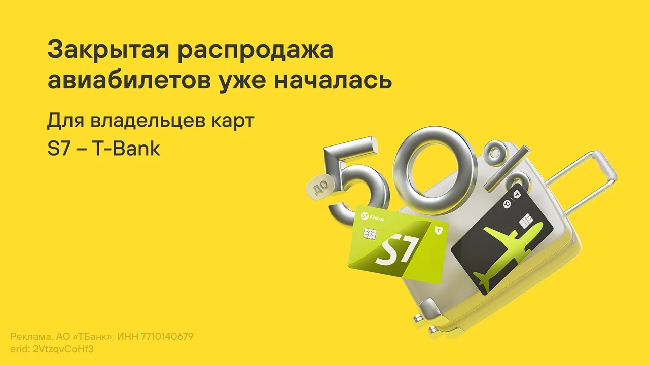 17 марта 2026 пройдет закрытая распродажа: скидки до 50% на билеты эконом- и бизнес-класса. Только для владельцев карты S7 — T-Bank, только один день.