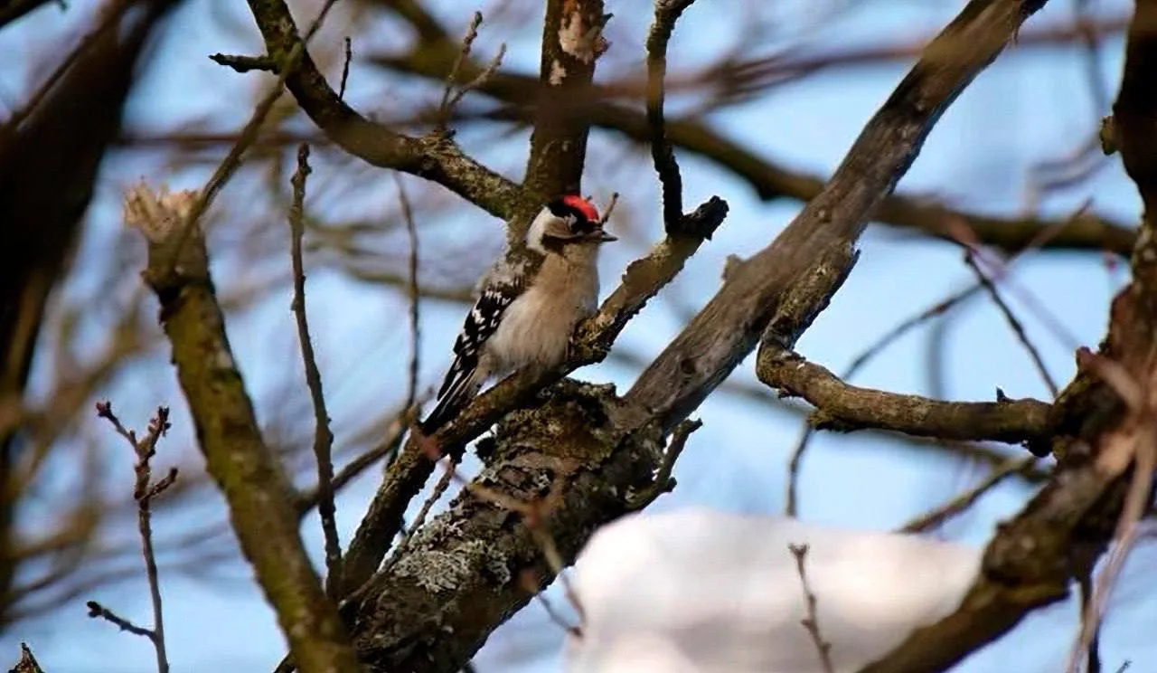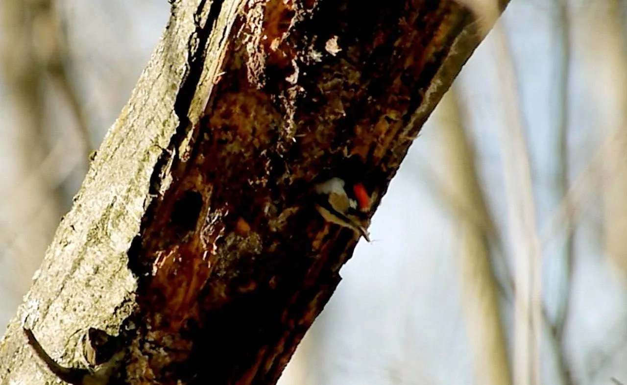 В Сосновке поселился малый пёстрый дятел. Самец сделал вход в дупло с северной стороны — так птицы иногда защищаются от перегрева.