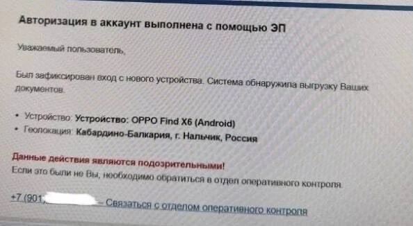 От лица якобы «ФНС» пользователям приходят письма о взломе личного кабинета. Мошенники пугают тем, что был выполнен вход с нового устройства и произведена выгрузка личных документов, и нужно обратиться в отдел оперативного контроля.