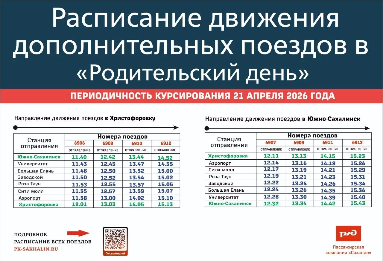 Во вторник, 21 апреля, дополнительные пригородные поезда будут курсировать по маршруту Южно-Сахалинск — Христофоровка и обратно, чтобы жители города могли добраться до кладбищенского комплекса № 3.