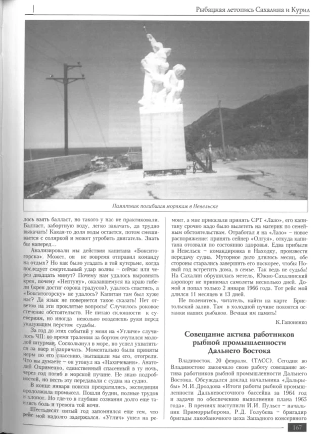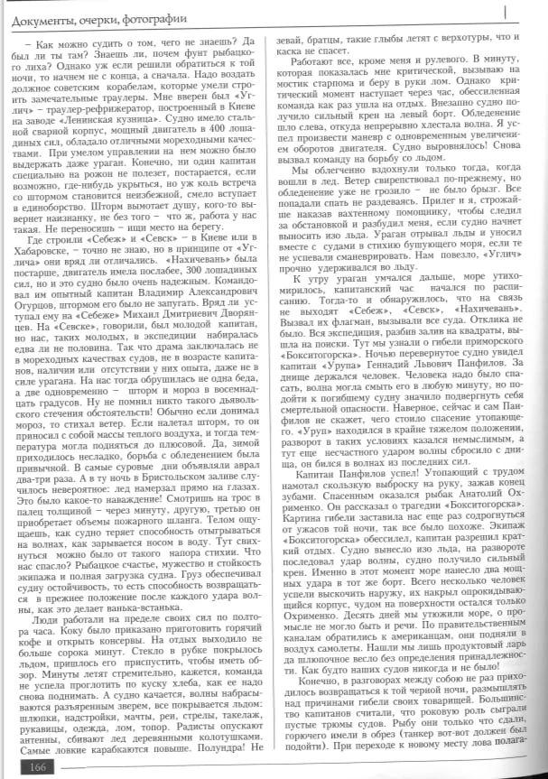 Тогда в лютый зимний шторм погибли четыре рыболовецких траулера: сахалинские «Себеж», «Севск», «Нахичевань», входящие в состав Невельской базы тралового флота, и приморский «Бокситогорск». Из всех экипажей, насчитывавших сотни человек, спастись удалось лишь одному – Анатолию Охрименко.