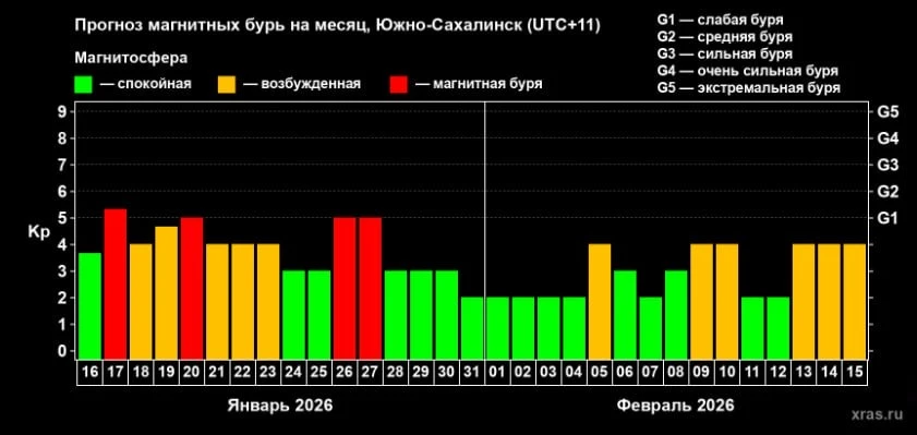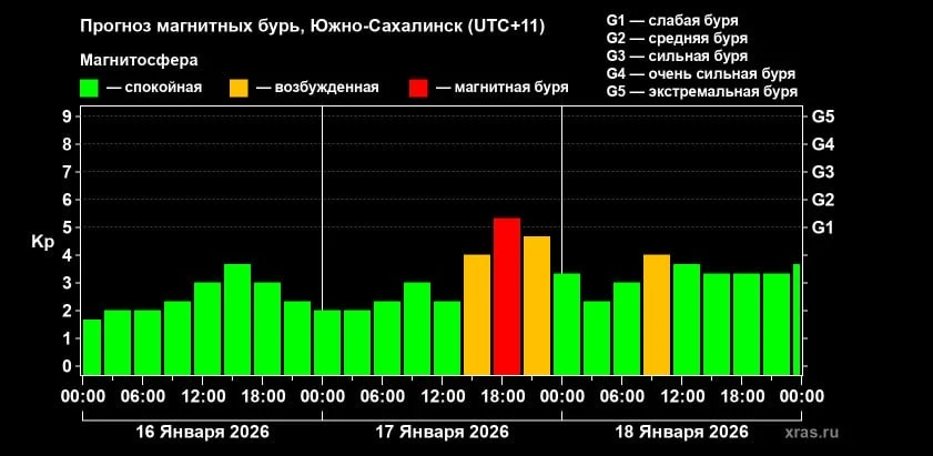 ❗️Кстати, в субботу, 17 января, ожидается магнитная буря. Он выпадет на промежуток с 17:00 до 20:00 по сахалинскому времени. По прогнозам специалистов, до конца января ожидаются еще три бури.