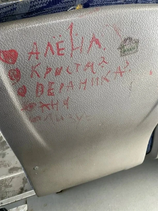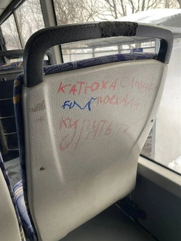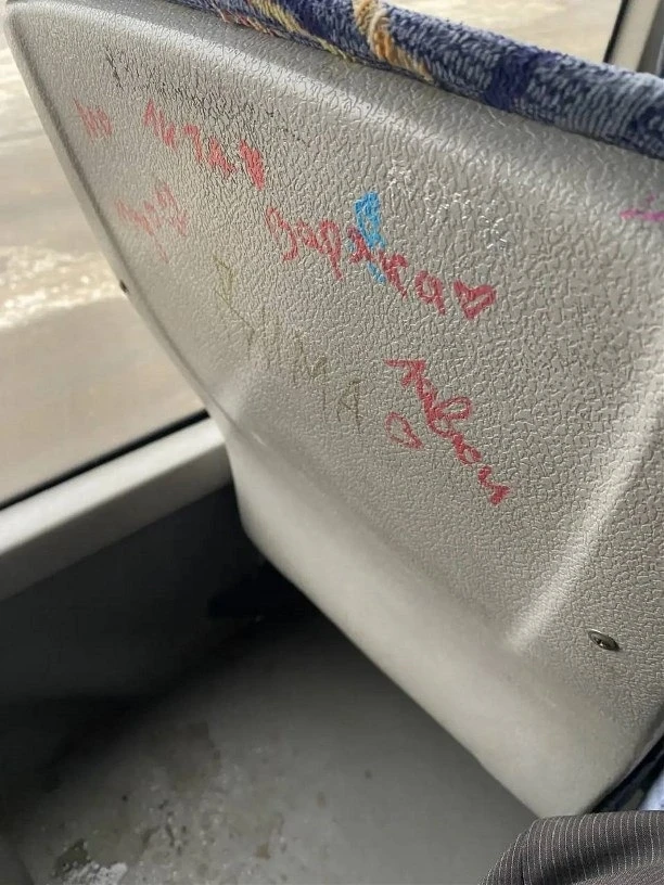 Неизвестные испортили сидения в общественном транспорте на маршруте №2 Углегорска. Судя по надписям, свой след в истории пытались оставить учащиеся младшей либо средней школы.