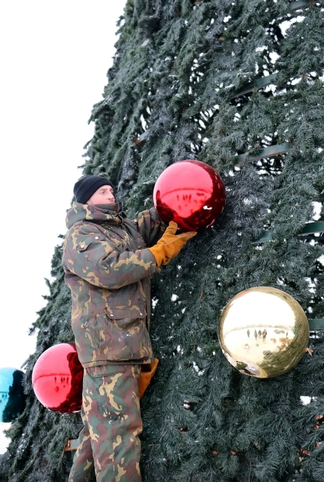 Каркас символа Нового года уже собран, рабочие приступили к его украшению. Горки также заняли свои места. Впереди строительство лабиринта, ледяной чаши, заливка катка вокруг сцены, установка ледяных фигур. В этом году тема новогоднего городка – герои мультфильмов.