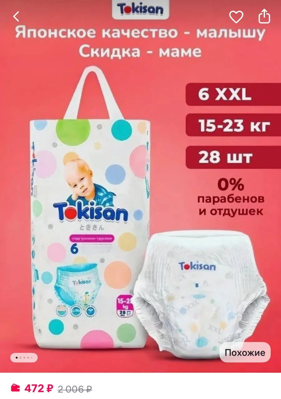 Tokisan Дышащие подгузники трусики детские, 6 размер (15-23 кг) 28шт