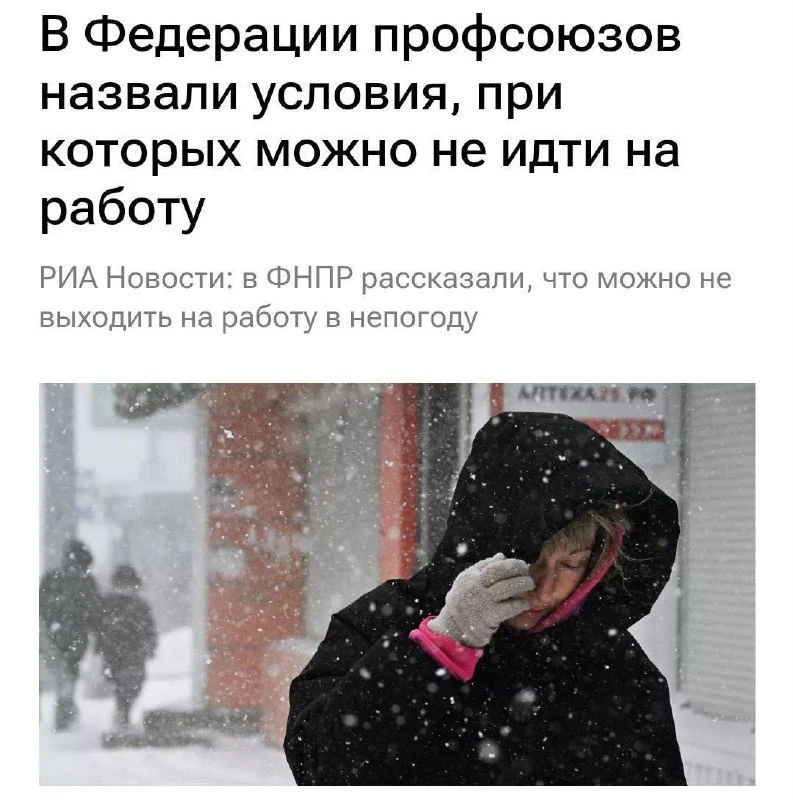 Федерация независимых профсоюзов России заявила, что сотрудник имеет полное право не выходить на работу при чрезвычайных погодных условиях. К ним отнесли снежные заносы, наводнения, пожары и другие катаклизмы. Главное условие — своевременно предупредить об этом работодателя.