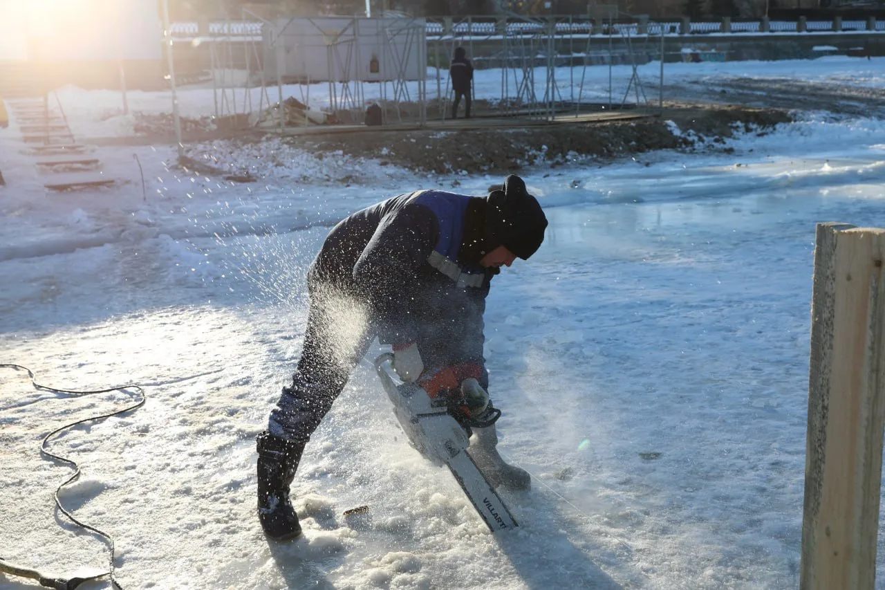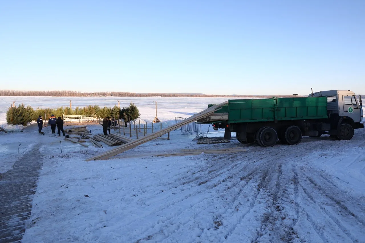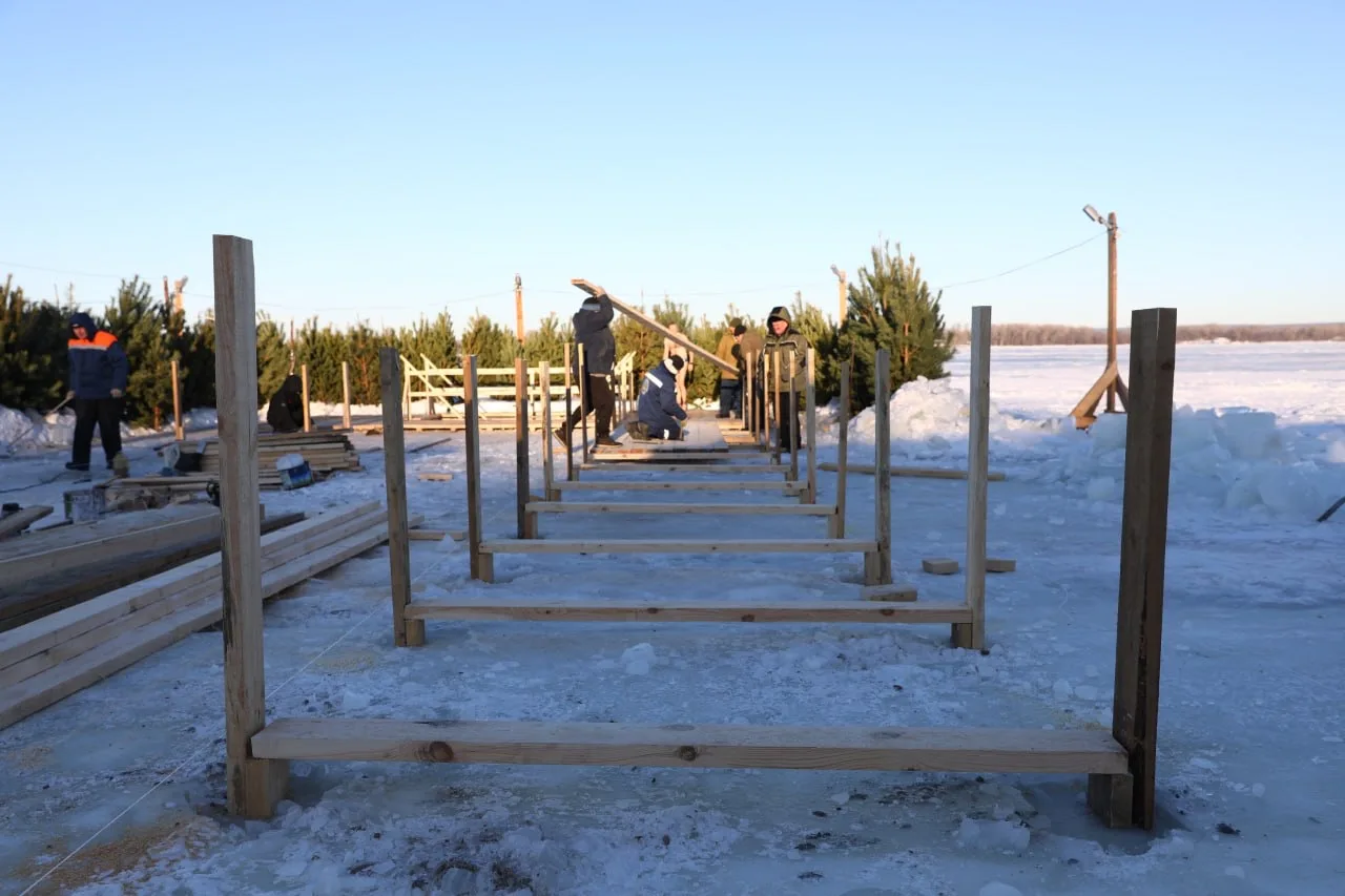 В связи с тем, что в этом году толщина льда ниже нормы, купель смонтирована с учётом дополнительных требований безопасности: конструкция купели, а также мостки и деревянные настилы имеют жёсткую опору на дно реки.