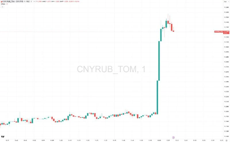 📊 За несколько минут юань вырос по отношению к российской валюте на 1,45%, до ₽11,358. По сравнению с закрытием предыдущего дня рост составил 1,7%.