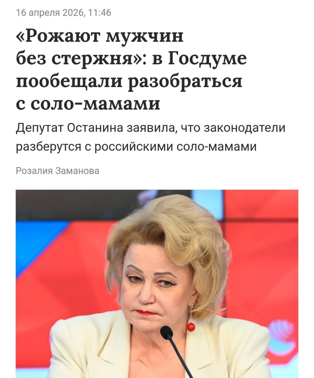 Матери-одиночки воспитывают слабых и излишне женственных мужчин, а также наносят ущерб институту брака, — так считает депутат Останина 🤷🏻♀