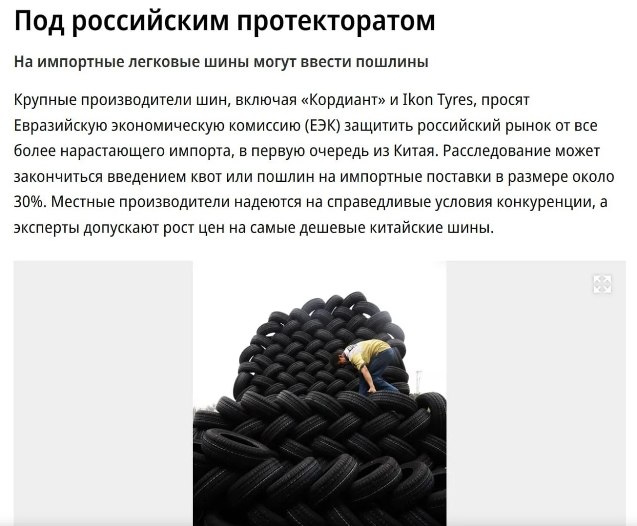 На импортные шины для легковых авто хотят ввести 30%-е пошлины — СМИ. Об этом попросили российские производители шин, чтобы защитить рынок РФ от импорта. Среди заявителей «Кордиант», «Кама», Ikon Tyres и «Белшина». Это приведёт к взлёту цен для потребителей, предупреждают эксперты