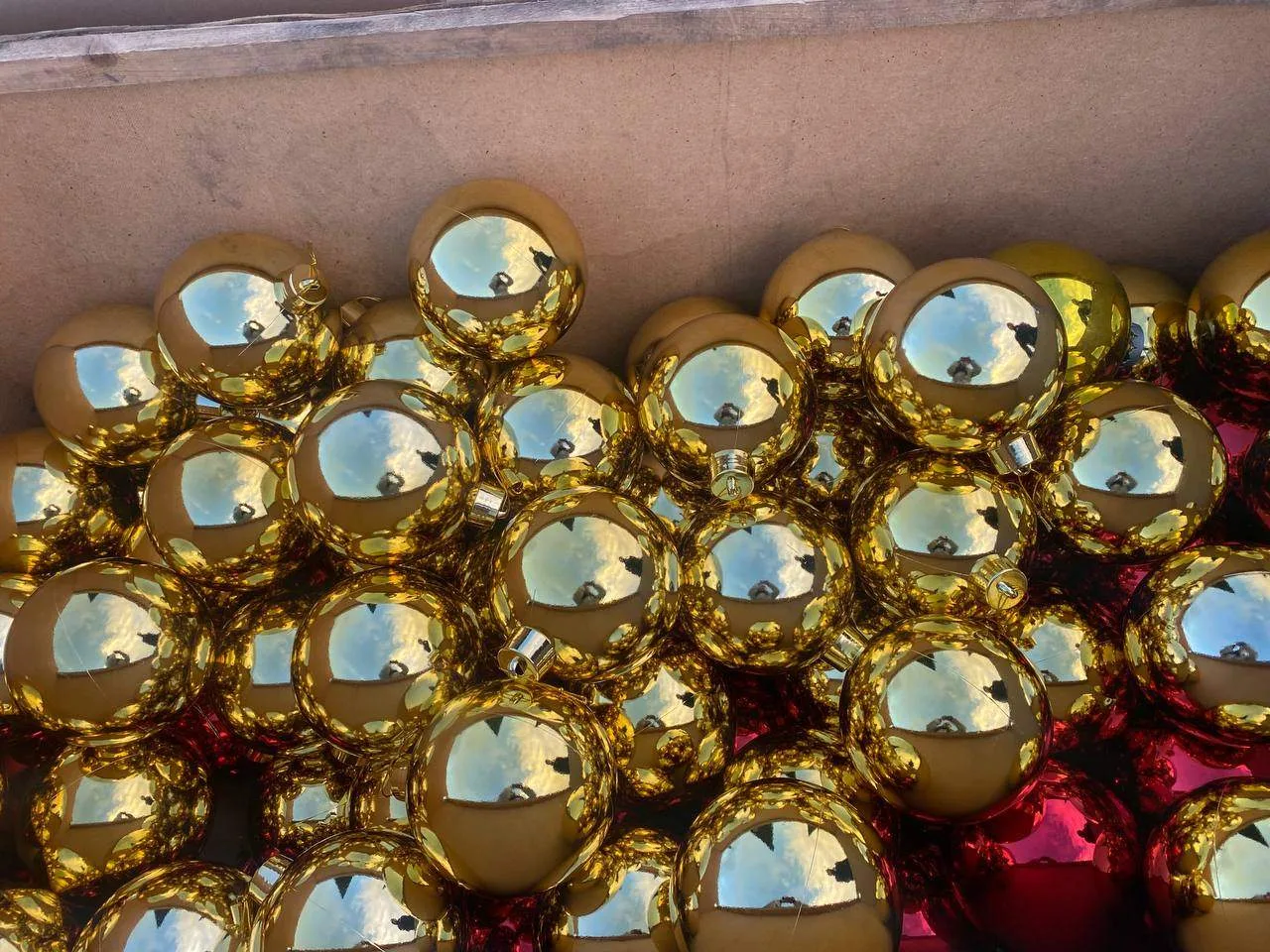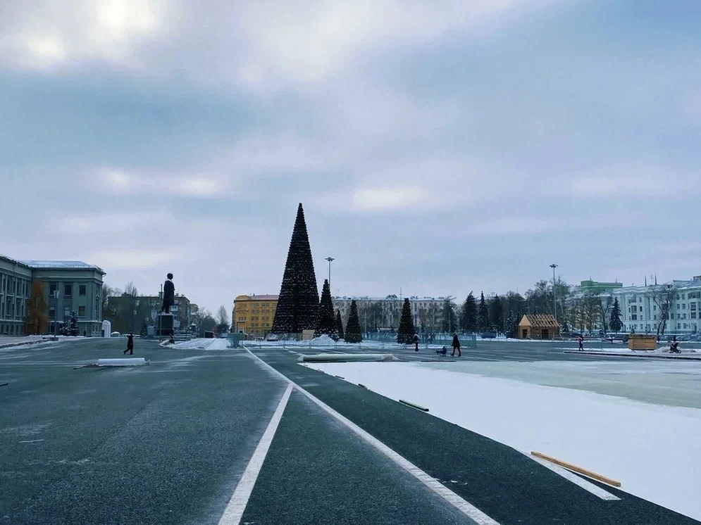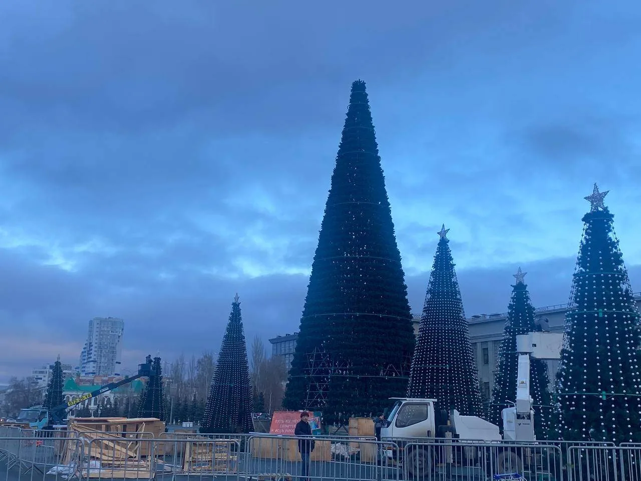 На площади Куйбышева установили семь искусственных елок, самая высокая из них — 25 м. Сейчас деревья украшают гирляндами и шарами.