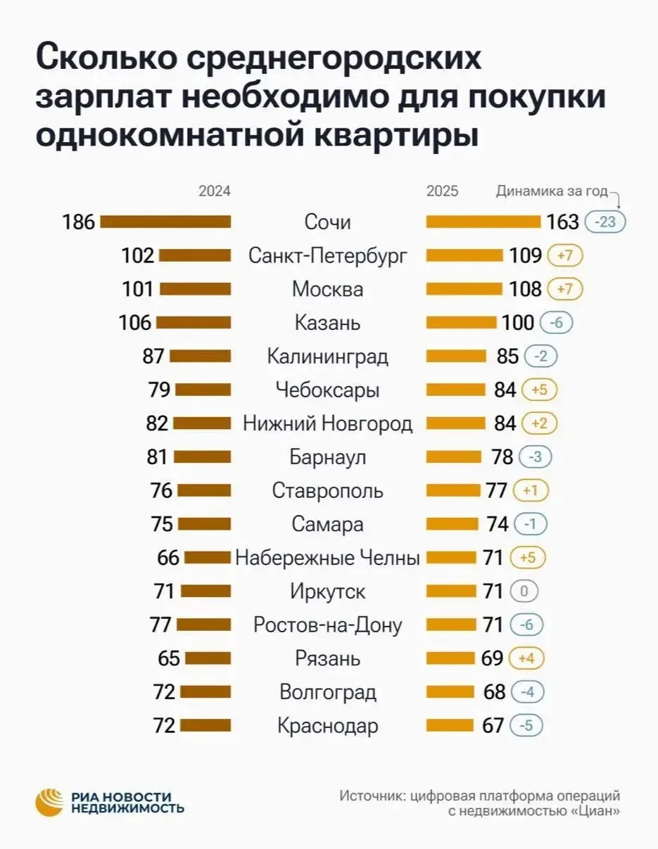 🔺Дольше всего копить жителям Сочи (13 лет и 7 месяцев, или 163 зарплаты), Москвы (9 лет и 1 месяц или 109 зарплат) и Санкт-Петербурга (9 лет или 108 зарплат).